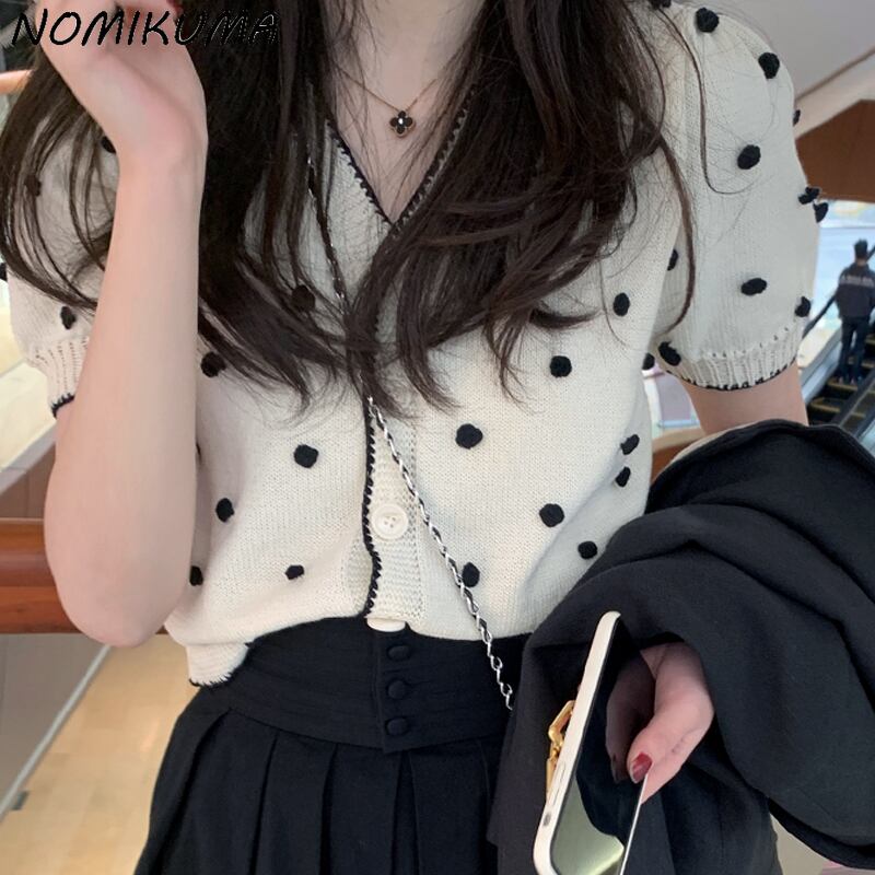 Nomikuma ドットパフスリーブ V ネックカーディガンセーターシングルブレストサマーニットトップニット 6J626 夏物 Vネック