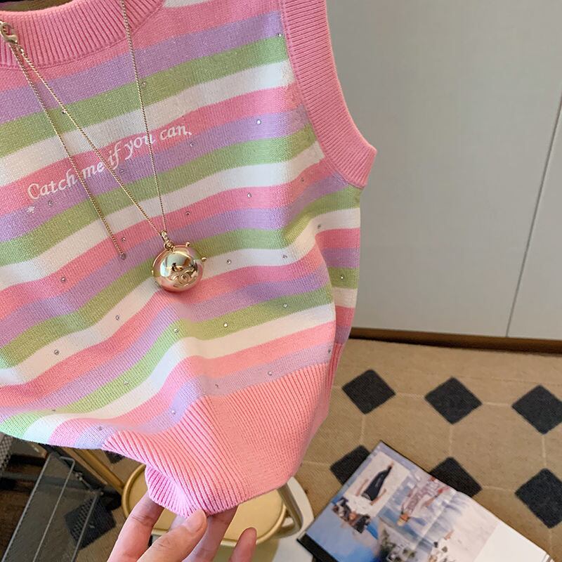Nomikuma ストライプノースリーブダイヤモンドアイスニットベスト夏甘いプルオーバーセータータンクトップ 大人ガーリー スウィート キュート カジュアル サマー 夏物 シルク