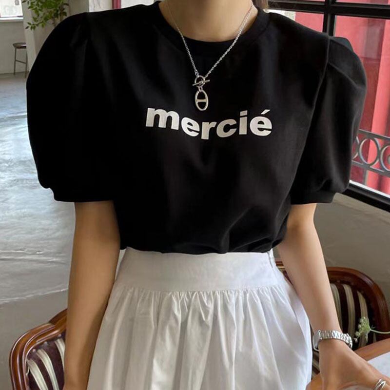 Nomikuma シック夏パフスリーブ O ネック Tシャツ文字プリント Tシャツトップス因果 O ネックシャツ サマー 夏物 Oネック