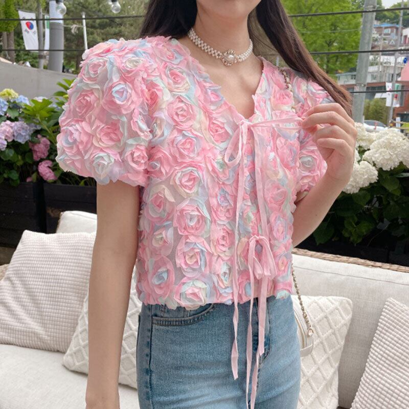 Nomikuma シック夏甘い花パフスリーブブラウストップスレースアップ V ネックシャツカミーサ 大人ガーリー スウィート キュート カジュアル サマー 夏物 Vネック フラワーデザイン