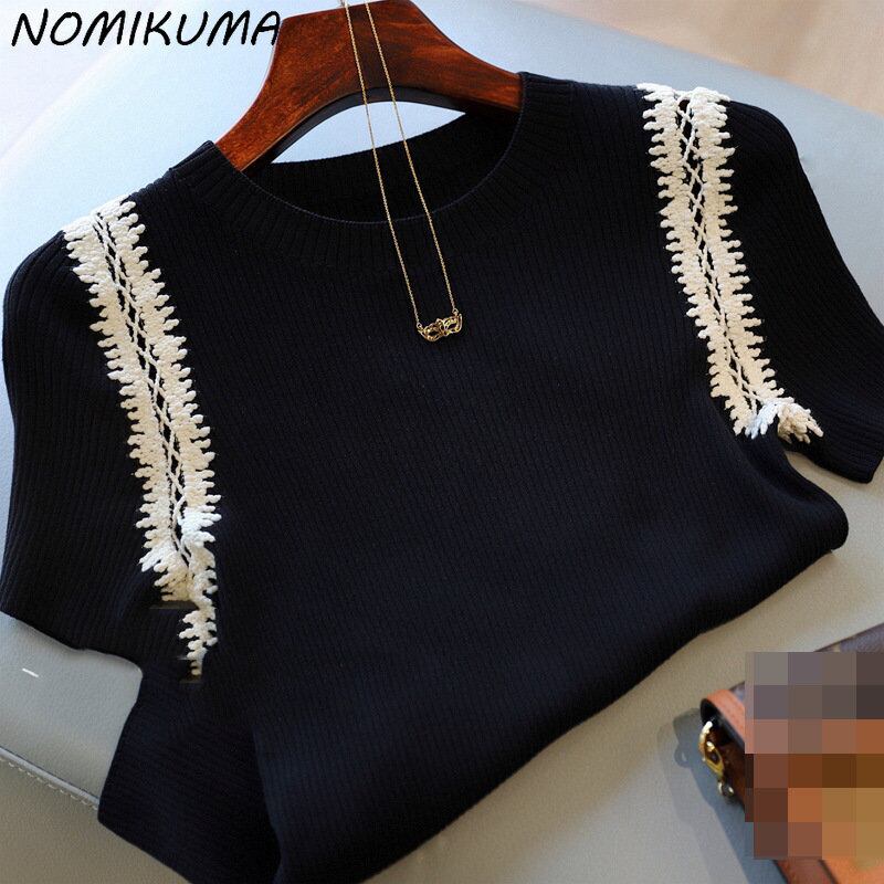 Nomikuma シックレースヒットカラーパッチワークニット夏薄いトップス半袖 O ネックプルオーバースリム Tシャツ ショート ハーフスリーブ サマー 夏物 Oネック