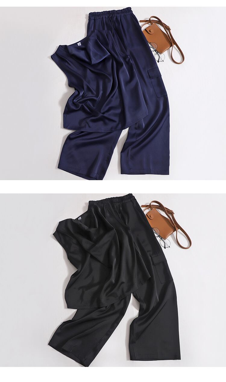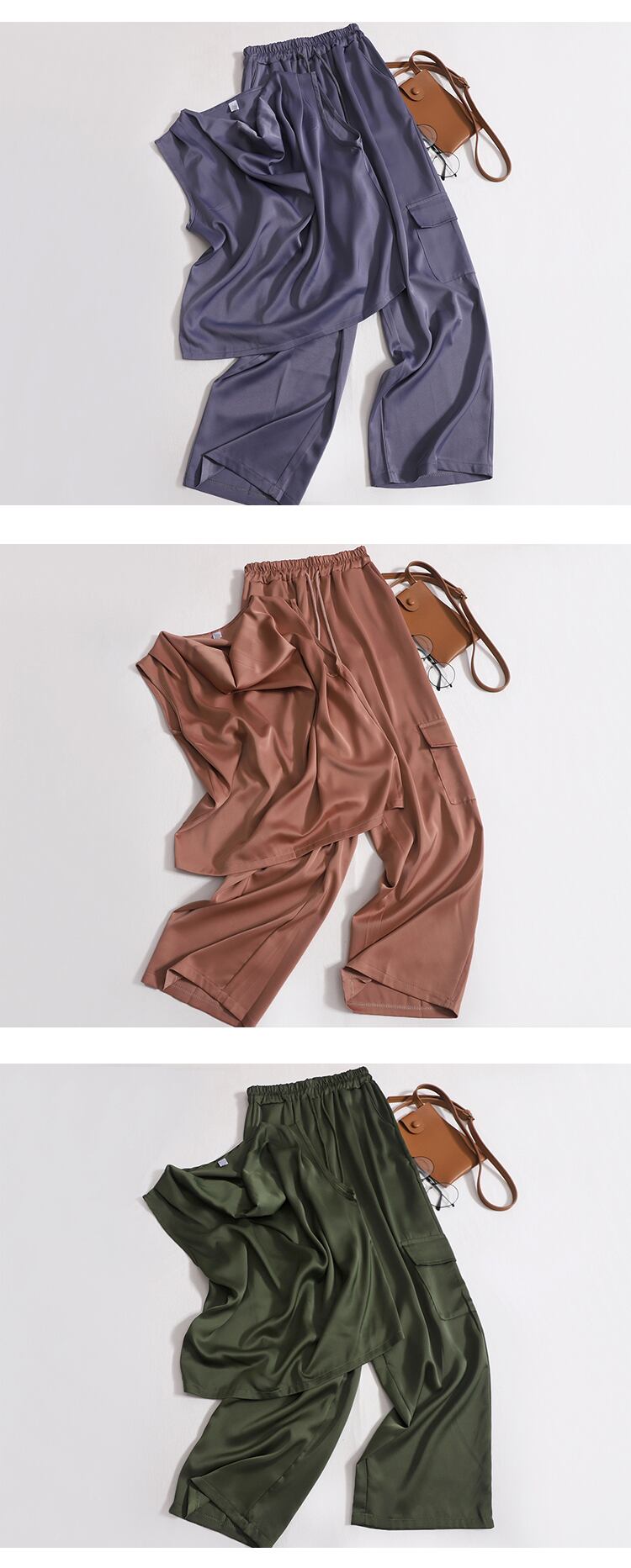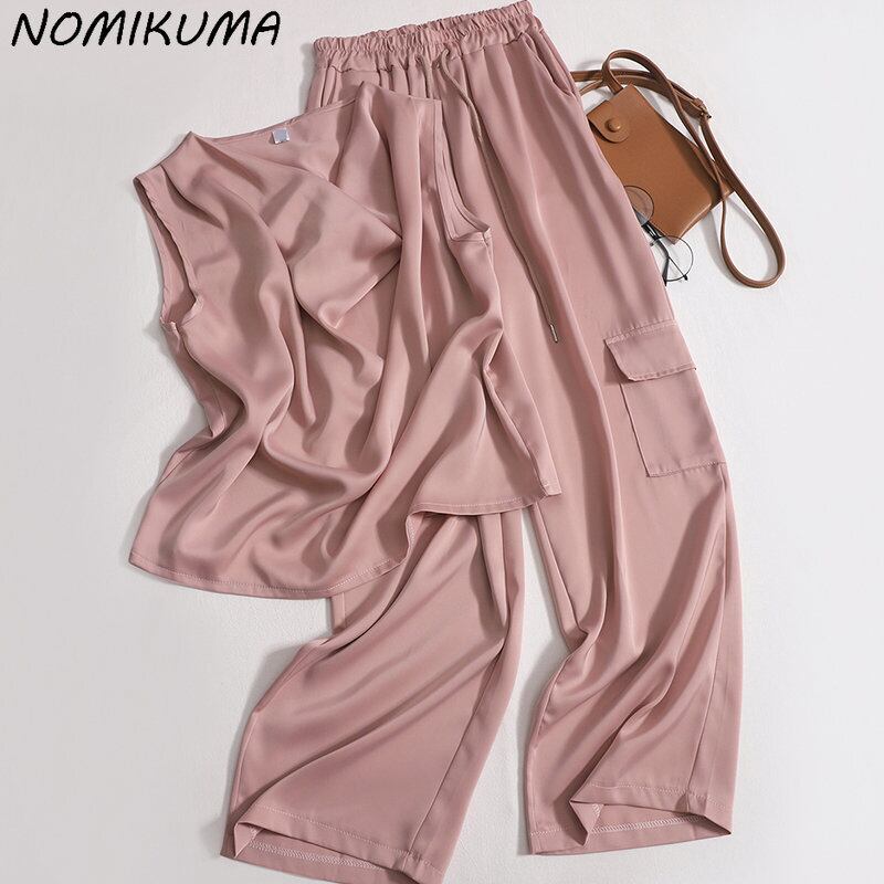 Nomikuma サテン 2 ピース レディース Ets レースアップ ウエスト カジュアル ロング ワイドレッグ パンツ + ノースリーブ カジュアル ベスト トップス ワイドパンツ
