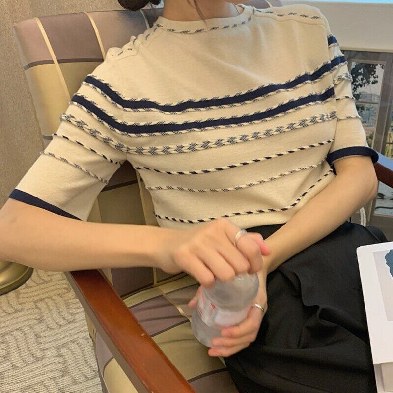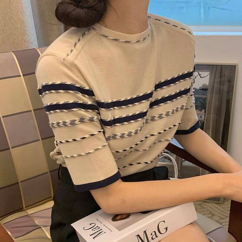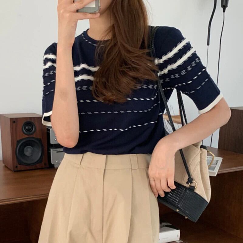 Nomikuma 夏女子 O ネックニット半袖シック Tシャツコントラストカラーストライプ Tシャツスリムトップス ショート ハーフスリーブ サマー 夏物 Oネック