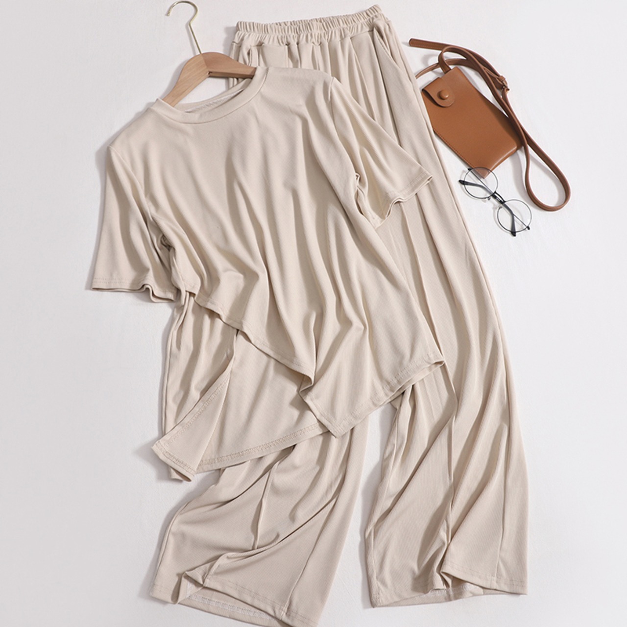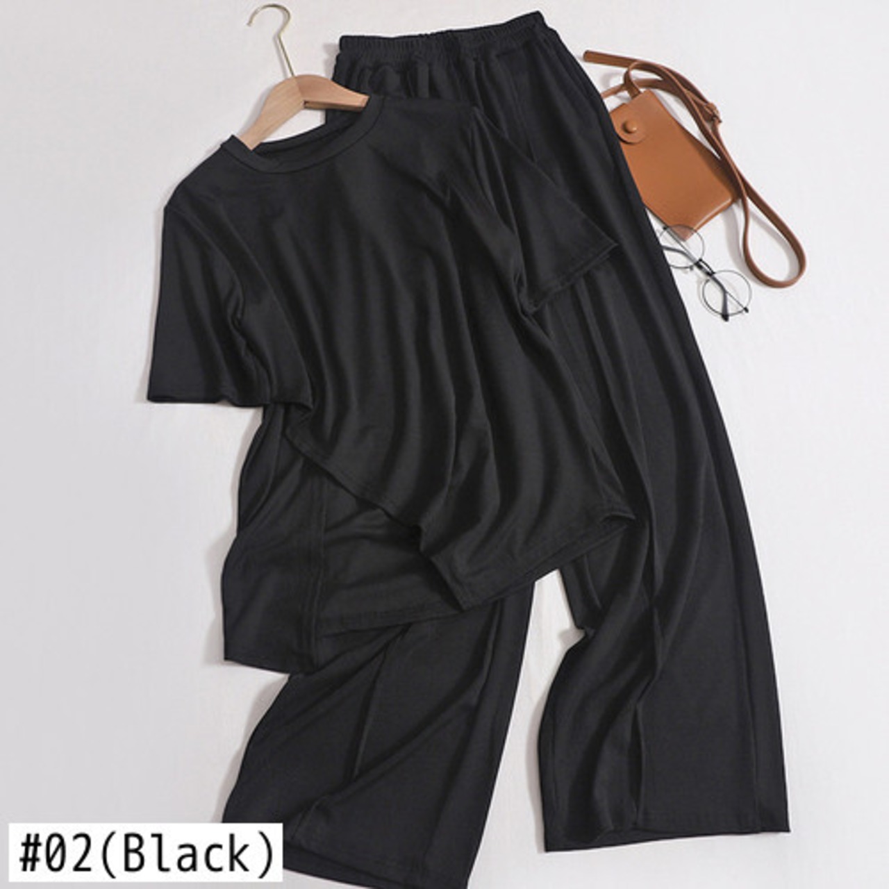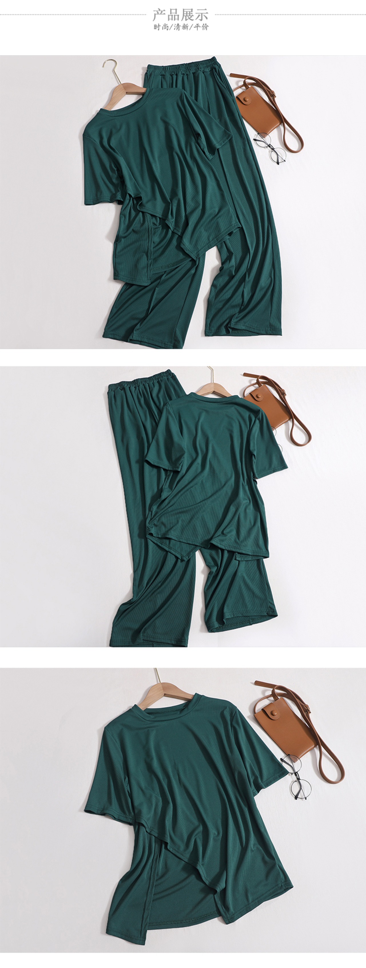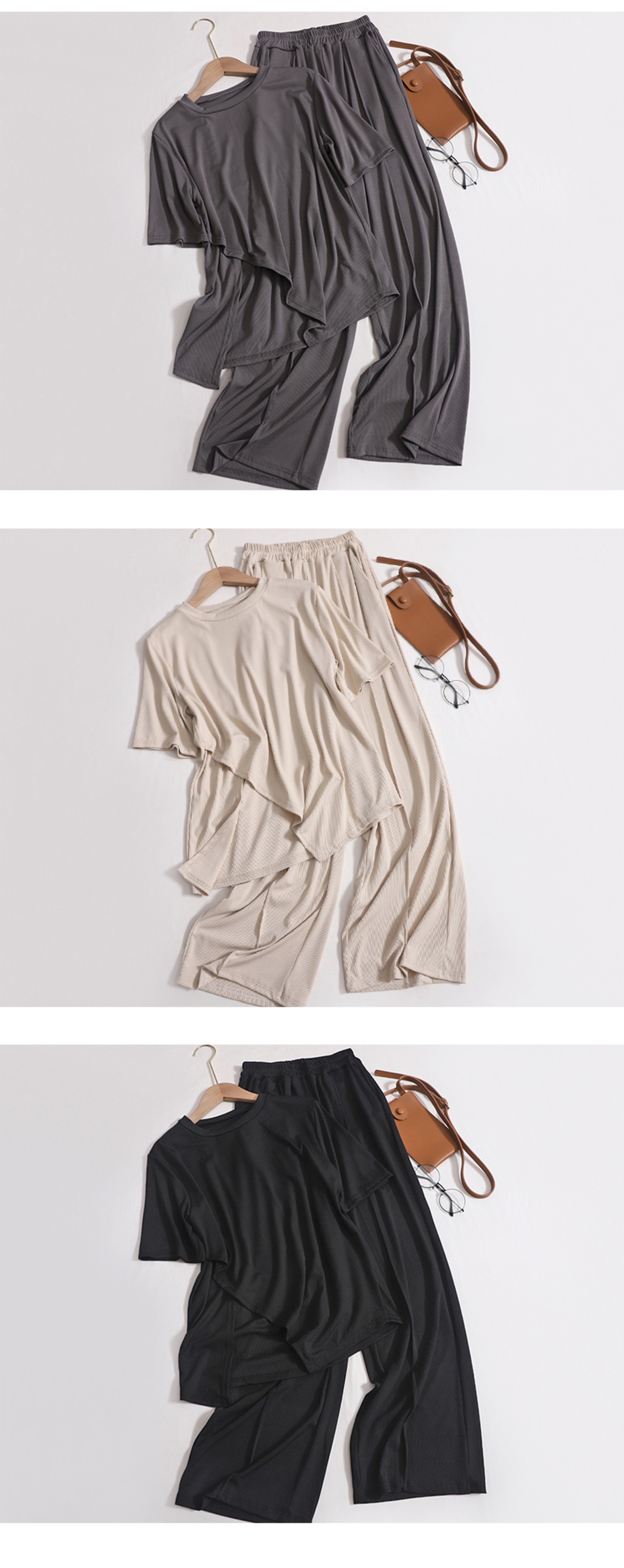 Nomikuma 因果セット夏スプリットソリッド半袖 O ネック T シャツ + ウエスト幅エレグロングパンツ 2 枚 ショート ハーフスリーブ サマー 夏物 Oネック ソリッドカラー