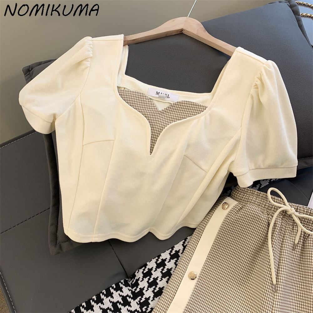 Nomikuma 夏 2 ピース衣装シックパフスリーブスクエアカラークロップトップス + レースアップウエストワイドレッグスプリットパンツ サマー 夏物 ワイドパンツ スクウェア