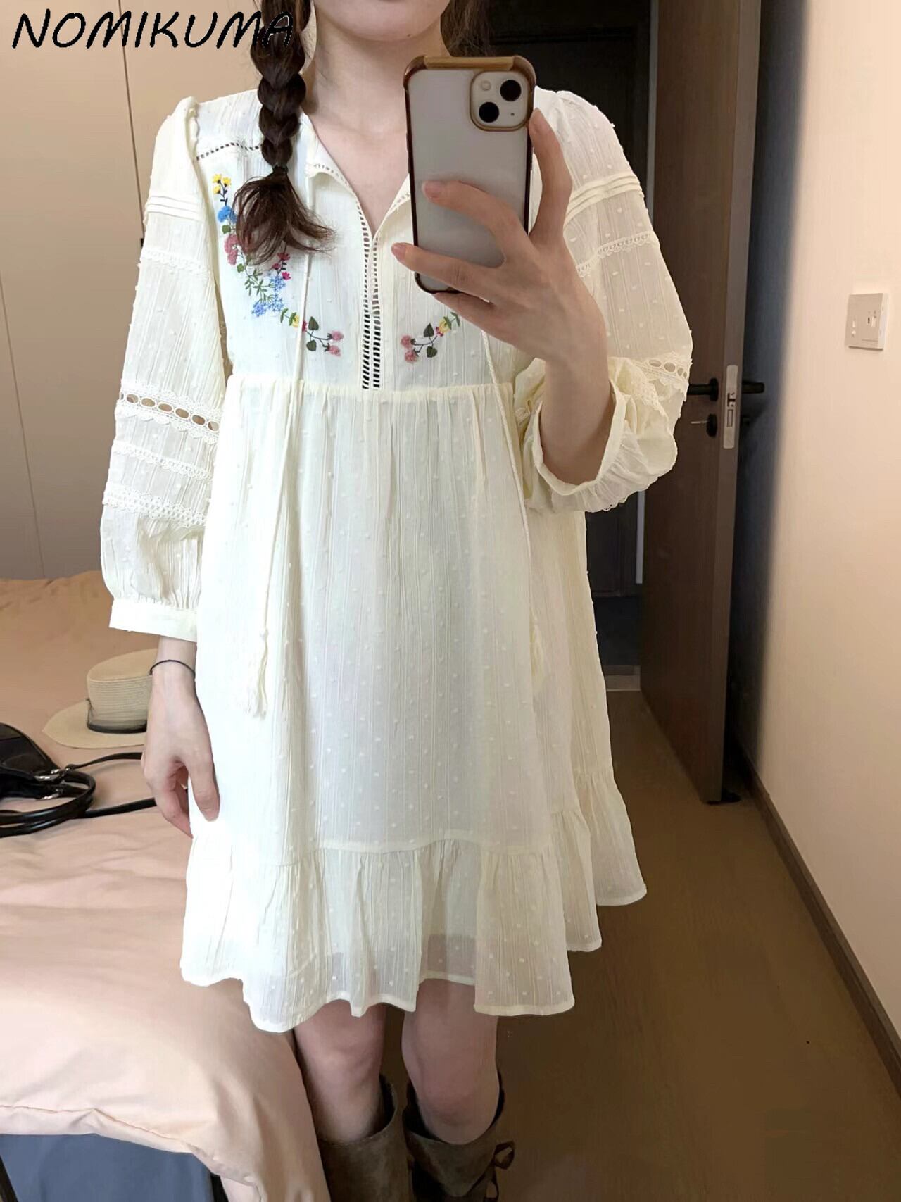 Nomikuma サマードレスシック花柄刺繍因果甘いドレスシックフリルランタンスリーブ Vestidos Femininos 大人ガーリー スウィート キュート カジュアル 夏物