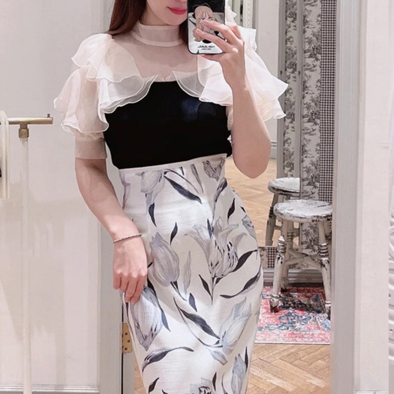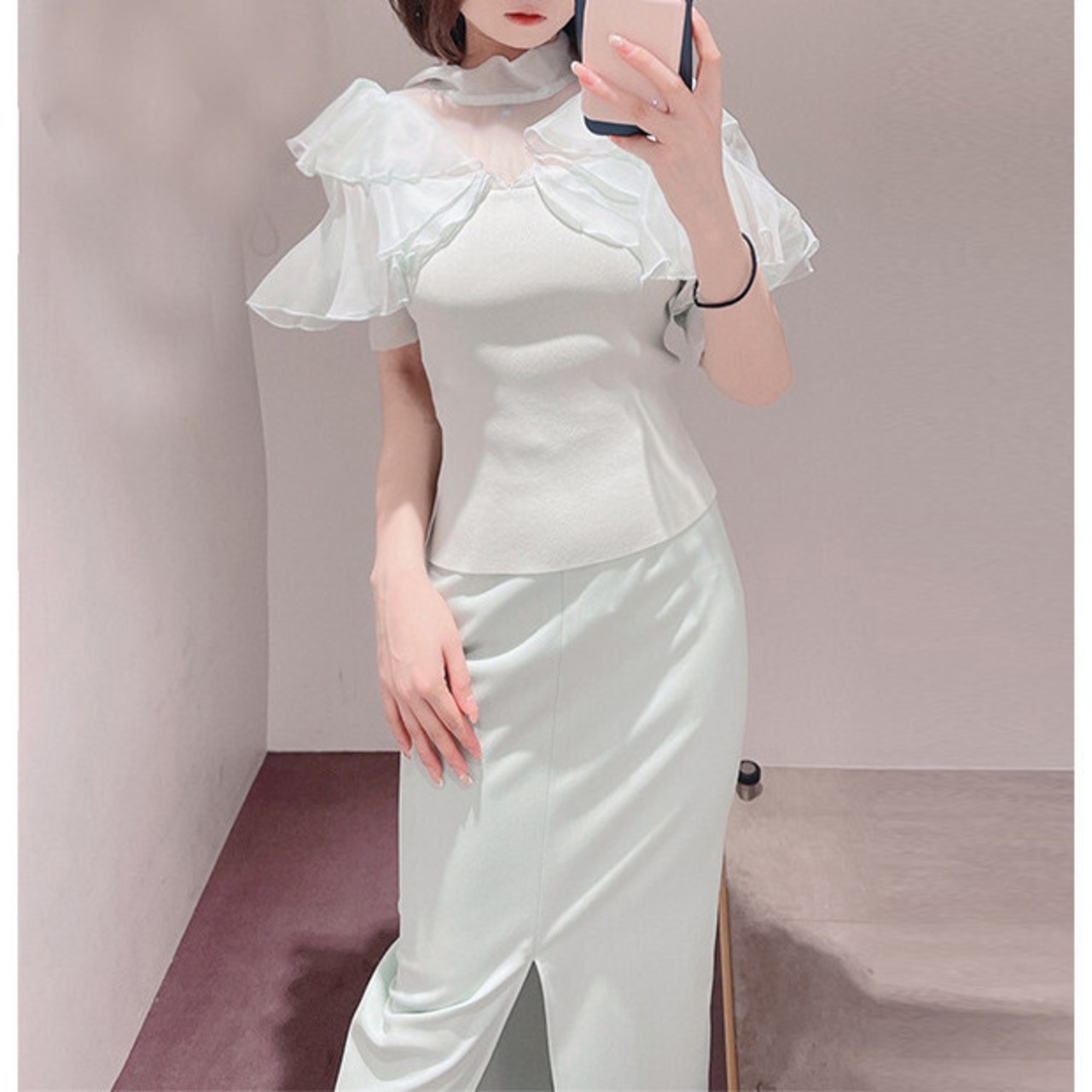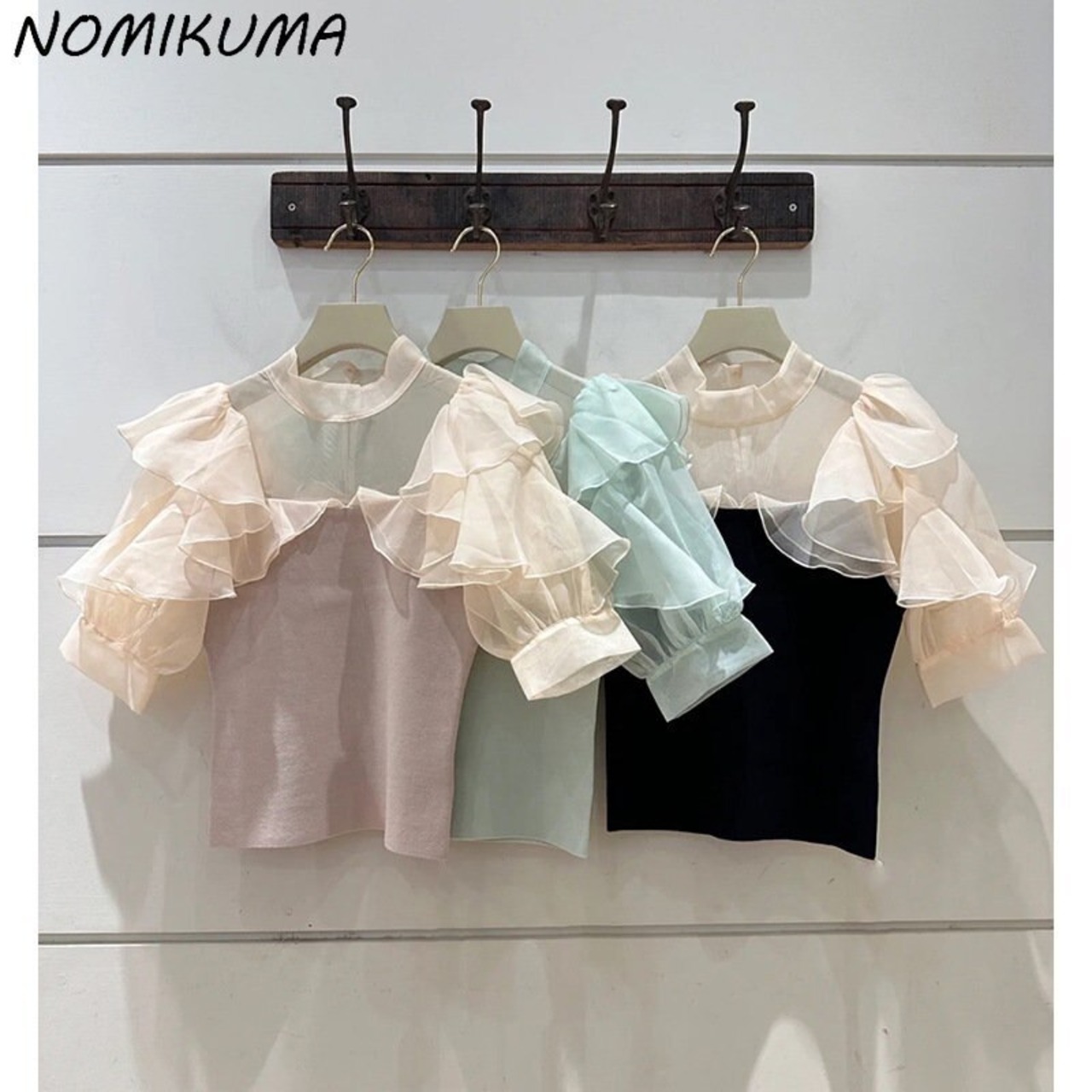 Nomikuma レディース サマーニット スリム ボトリング Tシャツ シックスタイル フリル メッシュ パッチワーク トップス すべてマッチ Tシャツ 夏物