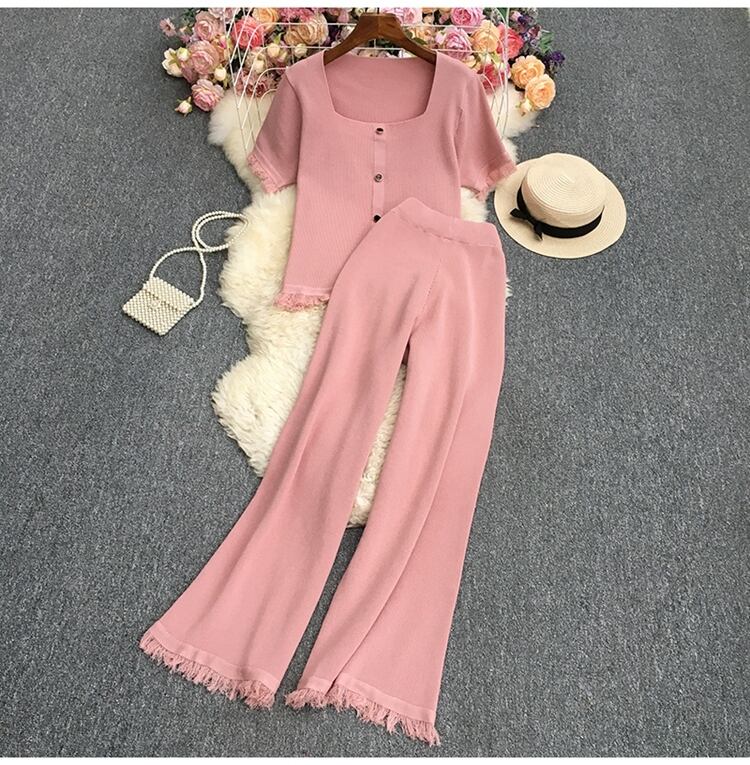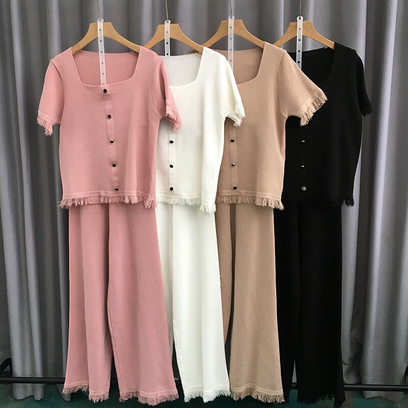 Nomikuma 2 点セット レディース 半袖 スクエアカラー トップス + ウエストシック テル ワイドレッグ ロング パンツ ショート ハーフスリーブ ワイドパンツ スクウェア