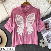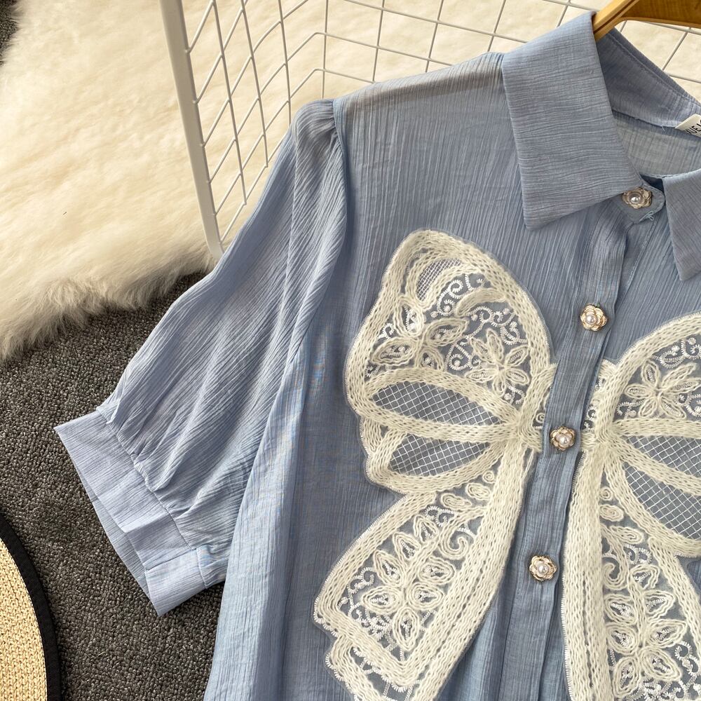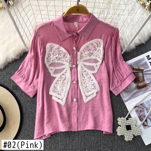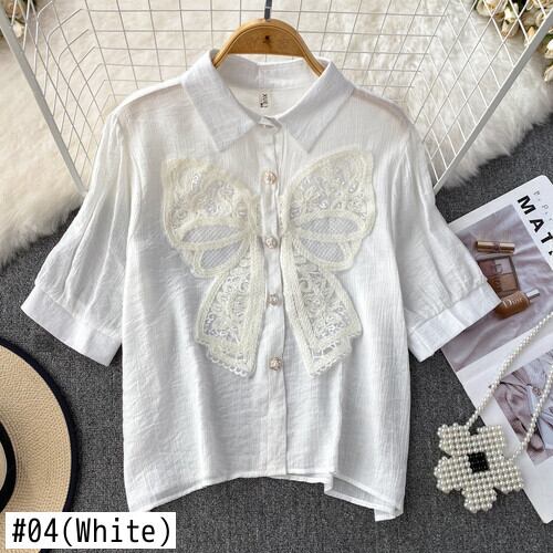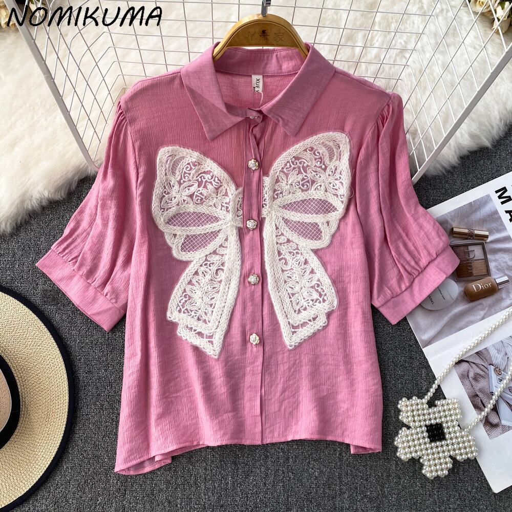 Nomikuma パフスリーブブラウスシックレースちょう結びパッチワークシャツ夏甘いトップス リボン 大人ガーリー スウィート キュート カジュアル サマー 夏物