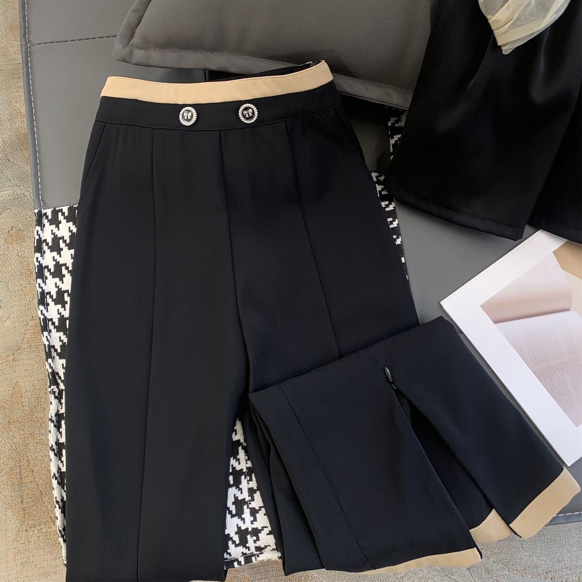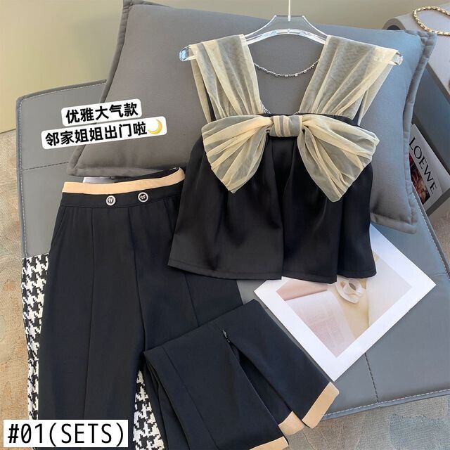 Nomikuma 2 ピースセットシックヒットカラーちょう結びタンクトップ + ウィストワイドレッグスプリットロングパンツ リボン ワイドパンツ