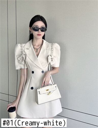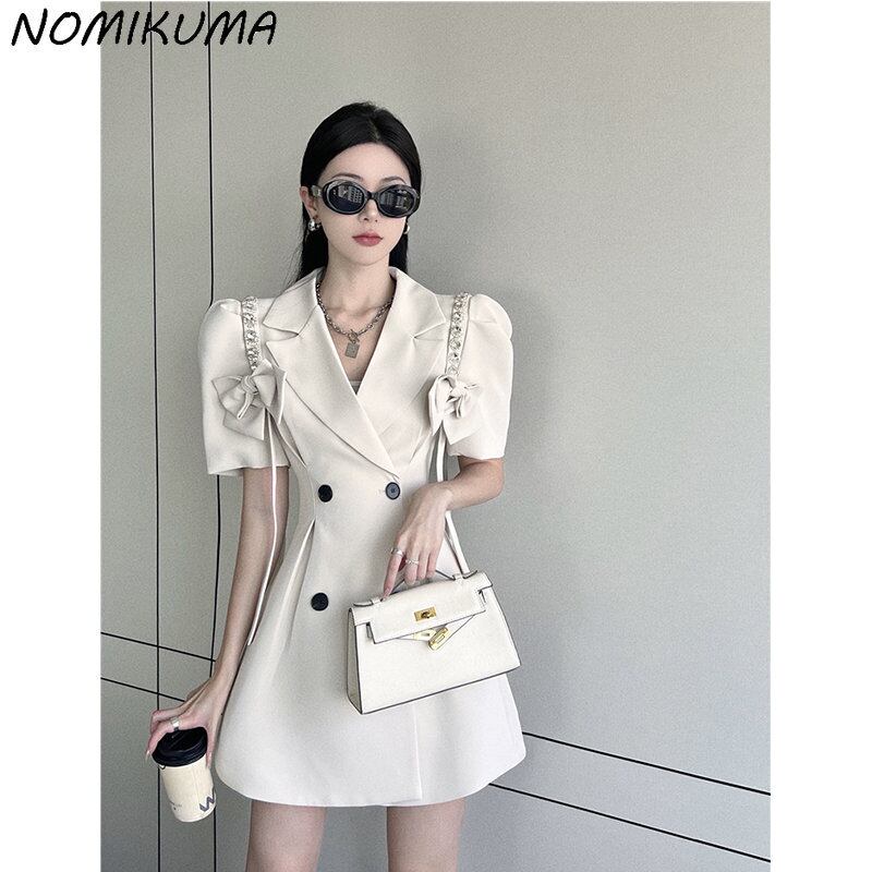 Nomikuma 夏ダイヤモンドちょう結びブレザードレスダブルブレストスリムウエスト Vestidos ノッチ襟ドレス リボン サマー 夏物