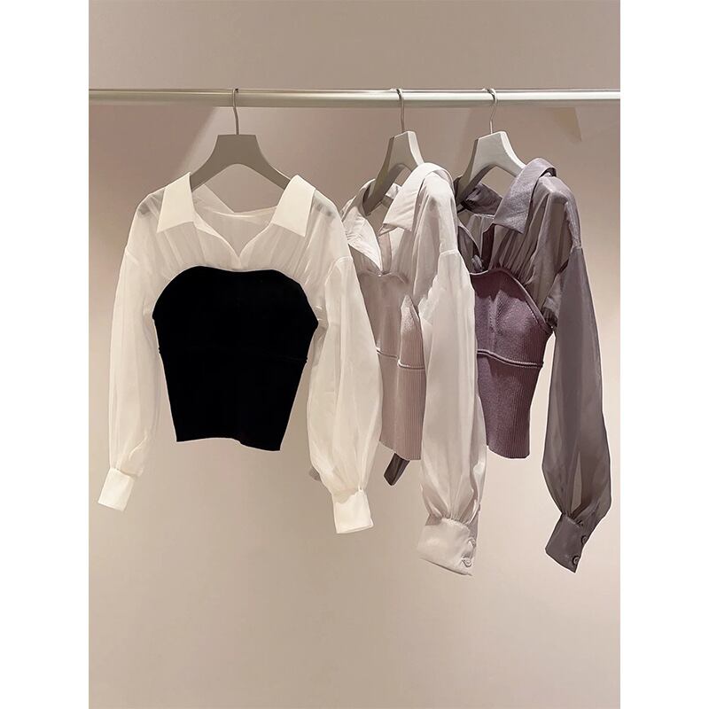 Nomikuma サマーシャツパッチワークニットブラウスランタンスリーブターンダウンカラーシャツトップ 夏物