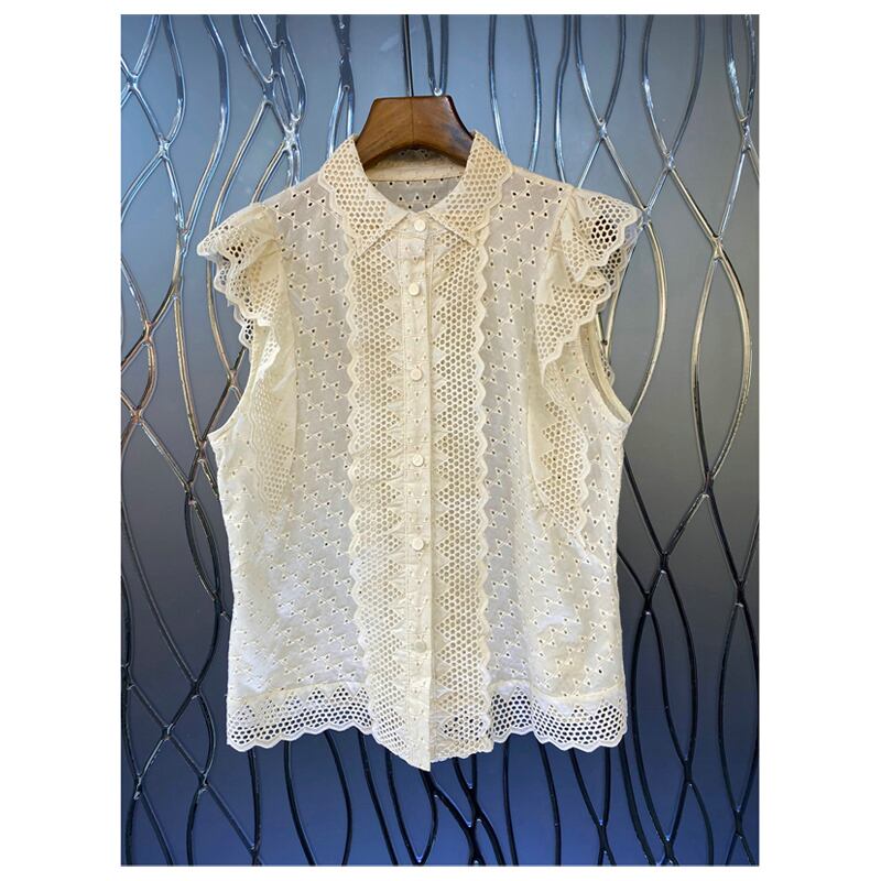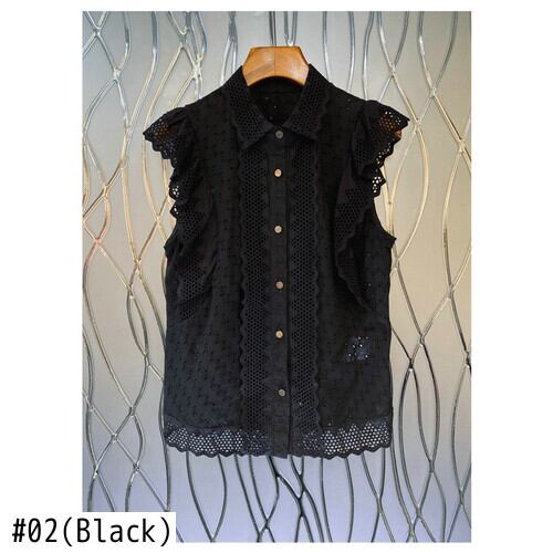 Nomikuma レース中空パッチワークフリルノースリーブブラウス Sumemr シャツカミーサ