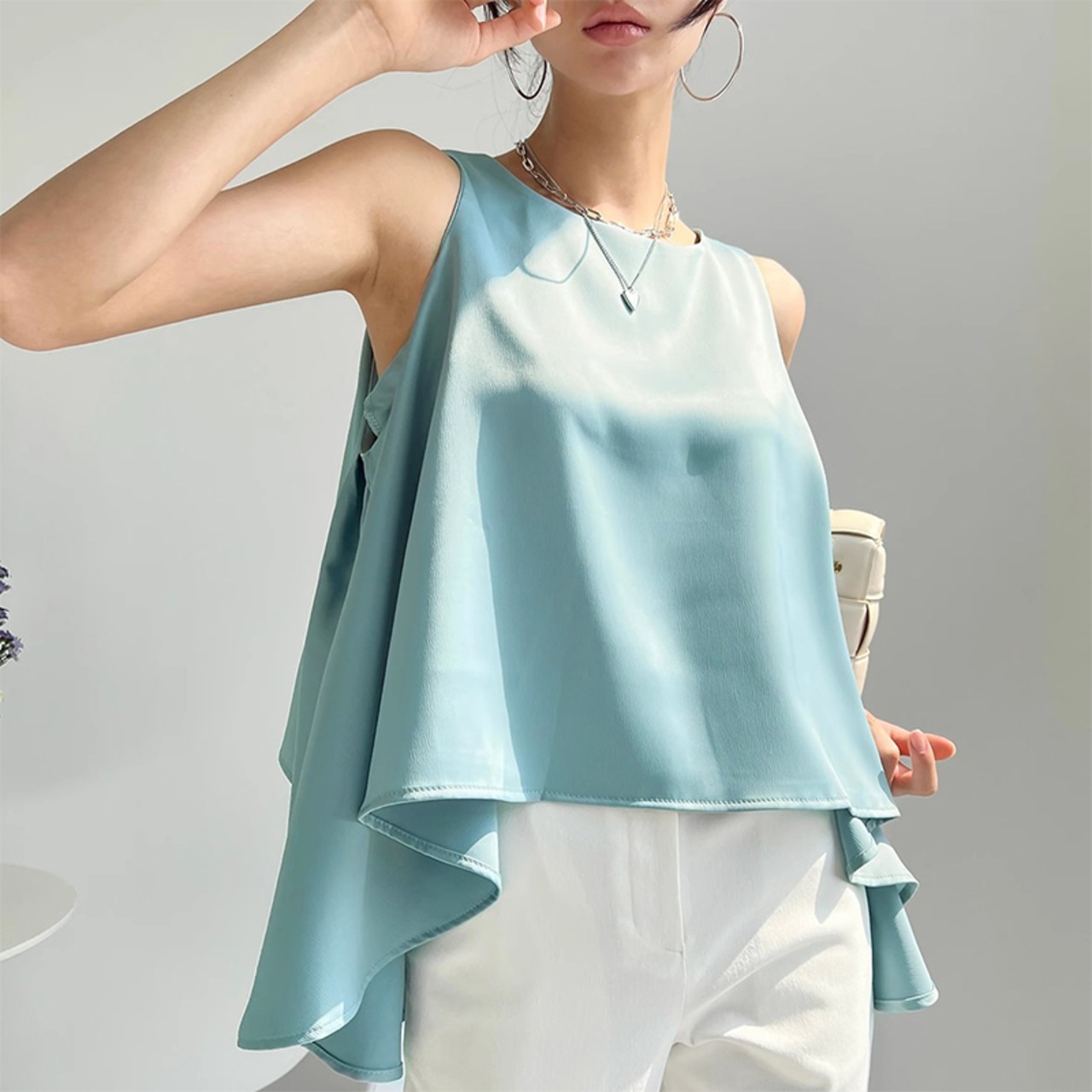 Nomikuma ノースリーブ O ネックタンクトップ因果不規則 Y2k トップス夏シックサテン サマー 夏物 Oネック ソリッドカラー