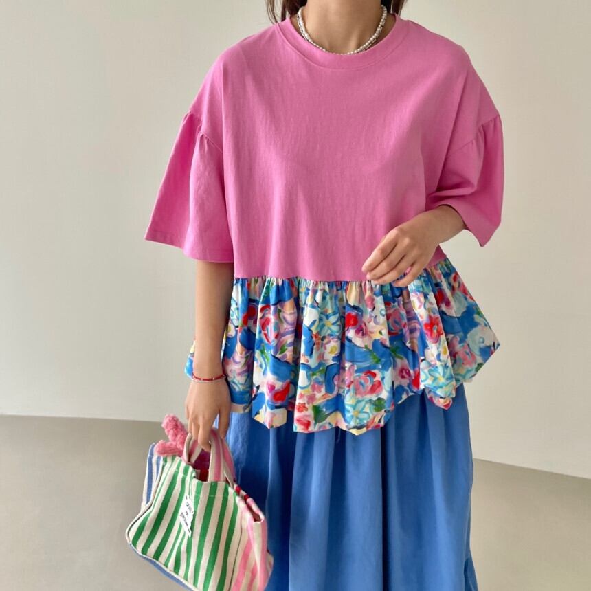 Nomikuma 因果花フリルパッチワーク甘いシャツシックフレアスリーブ O ネック Y2k トップ夏フェミニストシャツ 大人ガーリー スウィート キュート カジュアル サマー 夏物 花柄 Oネック