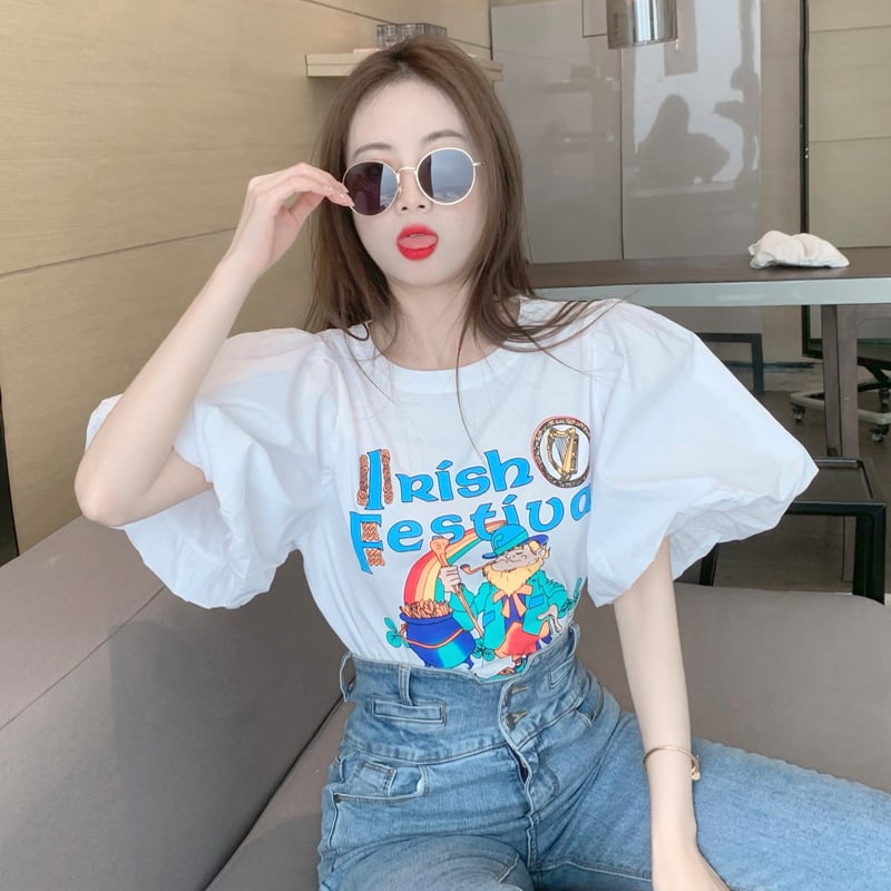Nomikuma 夏 Tシャツ原宿手紙プリント漫画 Tシャツトップス甘いグラフィック Tシャツ 大人ガーリー スウィート キュート カジュアル かわいい サマー 夏物