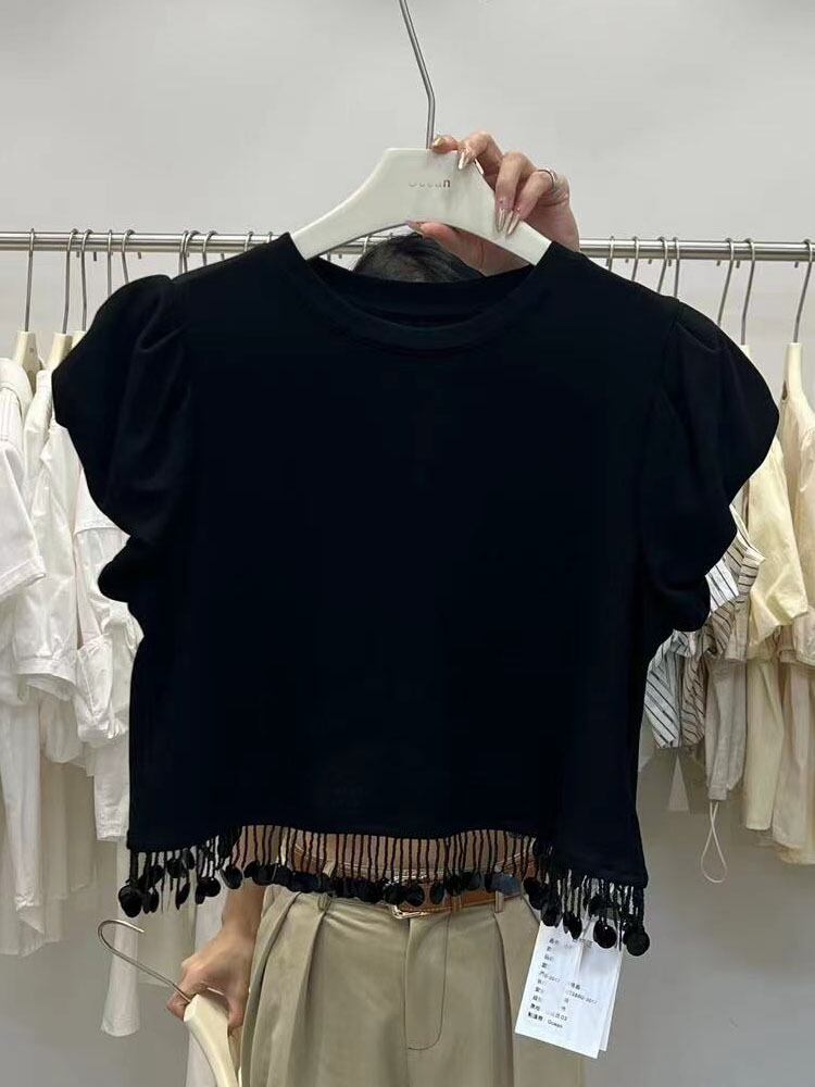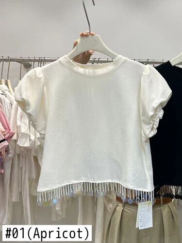 Nomikuma 夏パフスリーブ O ネック甘いシャツビーズテル不規則ゴシック Y2k トップグラフィック Tシャツ 大人ガーリー スウィート キュート カジュアル サマー 夏物 Oネック