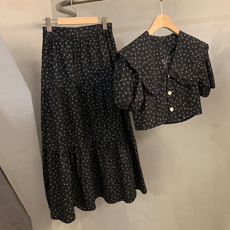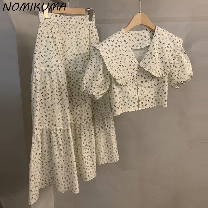 Nomikuma 夏花柄ツーピースセットレディース衣装パフスリーブピーターパンカラートップス + カジュアル A ラインスカート サマー 夏物 Aライン