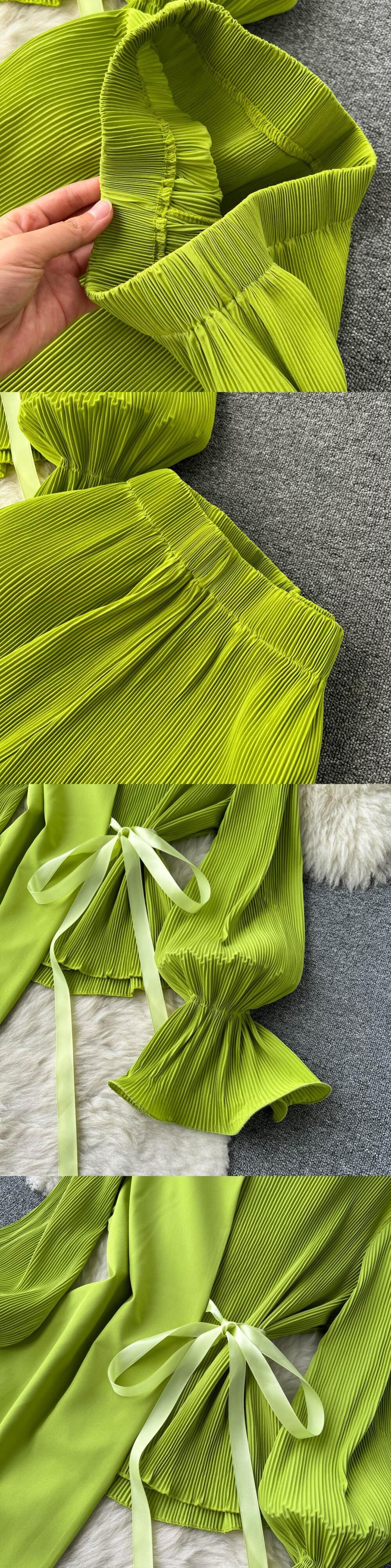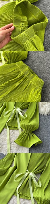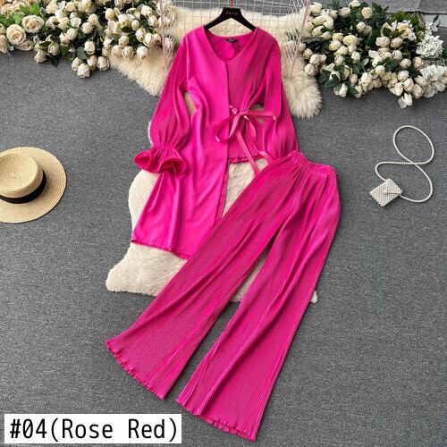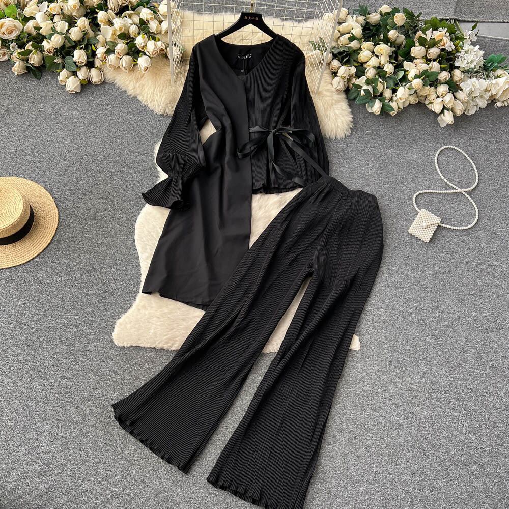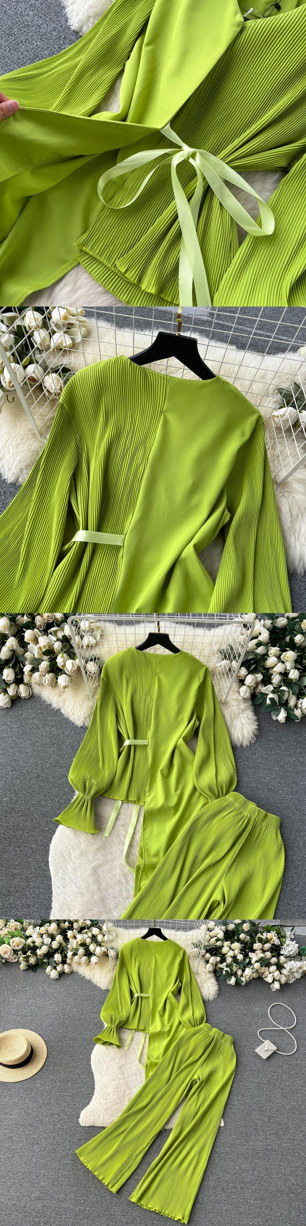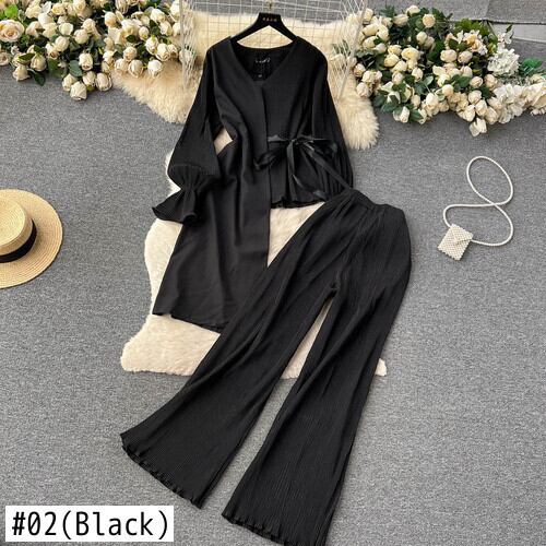 Nomikuma セクシー V ネックレースアップ不規則フレアスリーブトップ + ウエストゴムワイドレッグロングパンツ 2 点セットレディース衣装 エラスティック 伸縮 Vネック ワイドパンツ