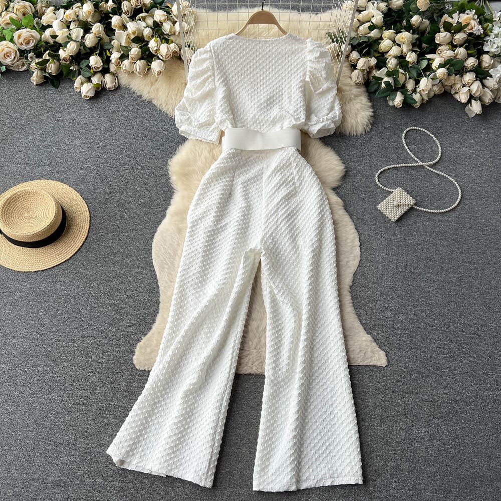 Nomikuma ベルトスリムウエストパフスリーブジャンプスーツ夏 V ネックロンパースファッションワイド脚長パンツボディスーツ ロング サマー 夏物 ハーネス Vネック ワイドレッグ ワイドパンツ