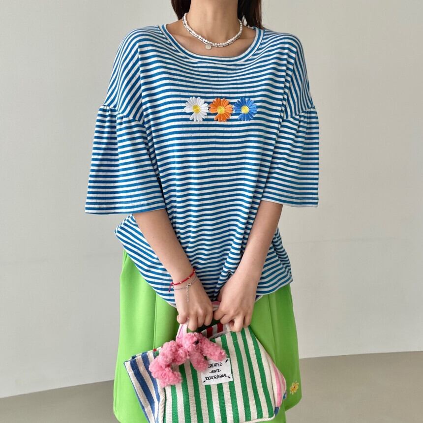 Nomikuma シック花刺繍ストライプ Y2k トップ夏袖グラフィック Tシャツ因果 O ネックプルオーバーシャツ サマー 夏物 花柄 Oネック