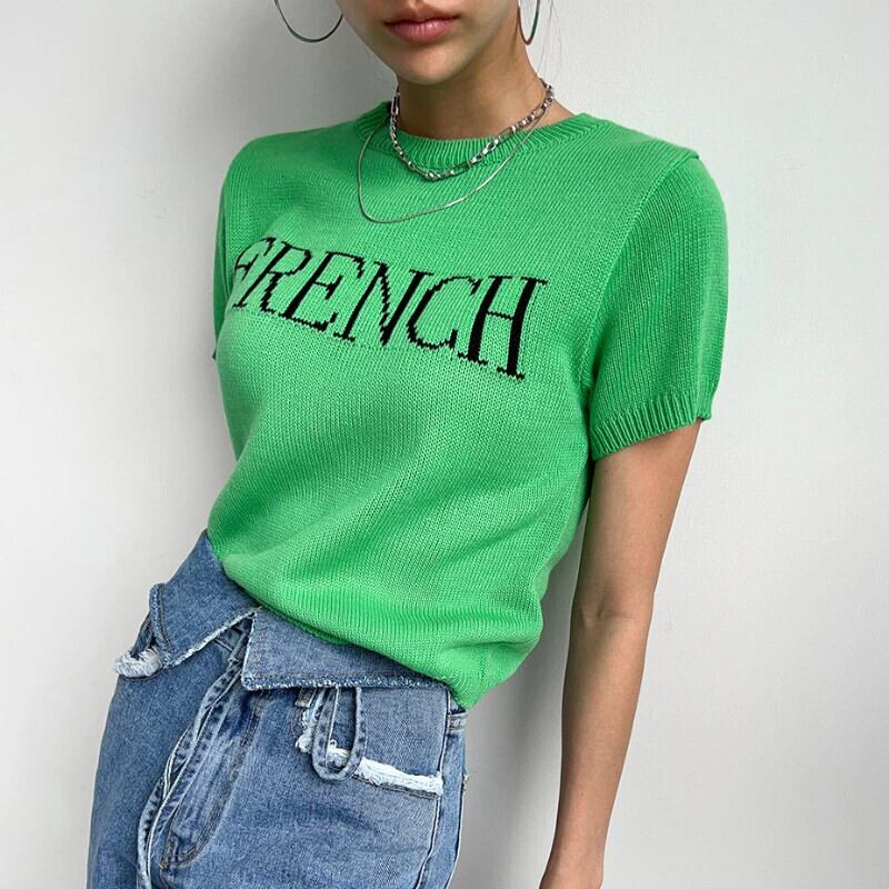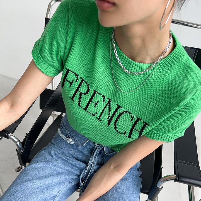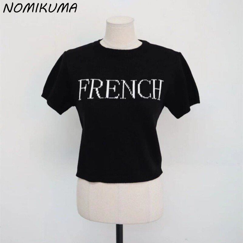 Nomikuma 夏 O ネック手紙半袖ニットシャツ因果プルオーバーグラフィック Tシャツ Y2k 服 ショート ハーフスリーブ サマー 夏物 Oネック