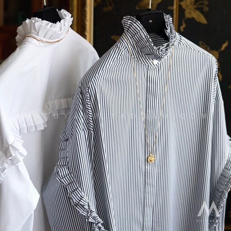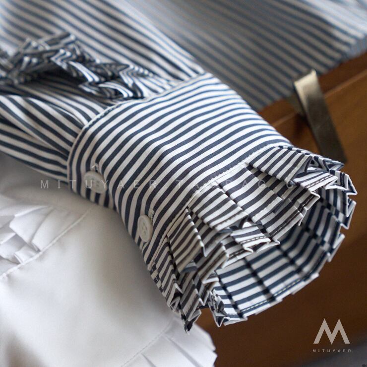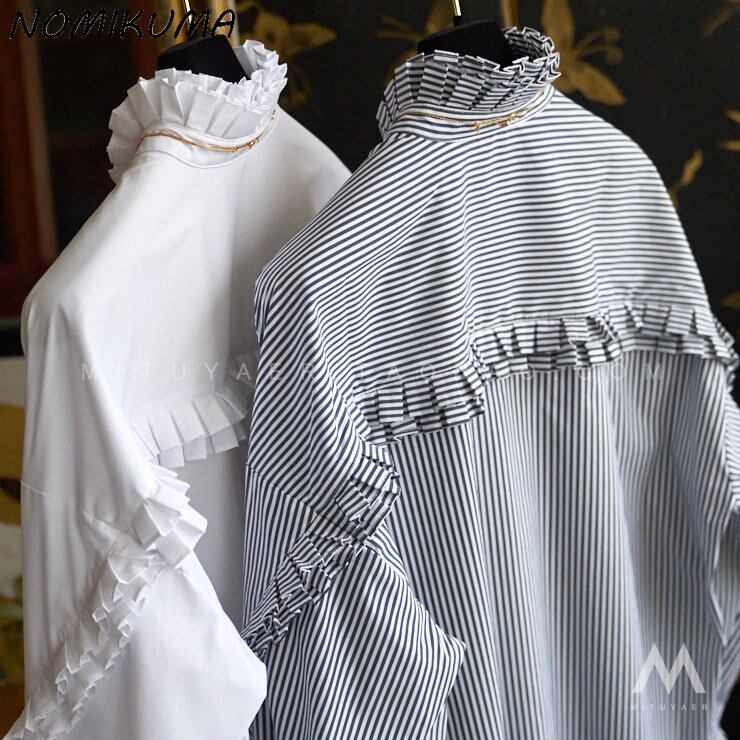 Nomikuma シックフリルパッチワークストライプブラウスレディース長袖スタンドネックトップ ロング