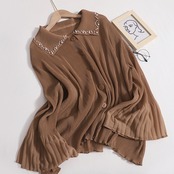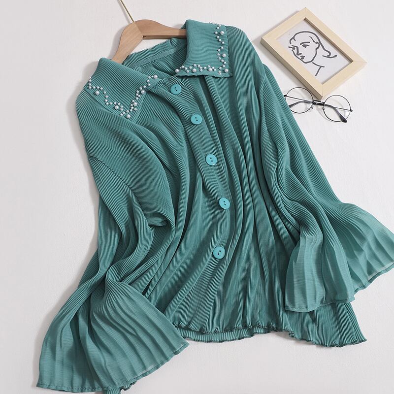 Nomikuma ビーズターンダウンカラープリーツブラウスフレア長袖シャツ ロング