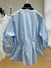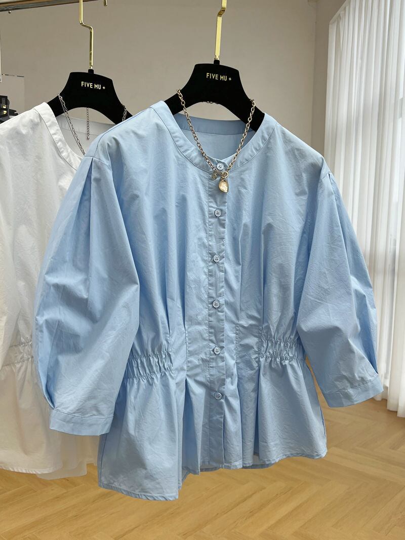 Nomikuma De Moda 夏七分袖 O ネック ブラウス シャツ因果スリム ウエストひだ甘いトップス 大人ガーリー スウィート キュート カジュアル サマー 夏物 Oネック