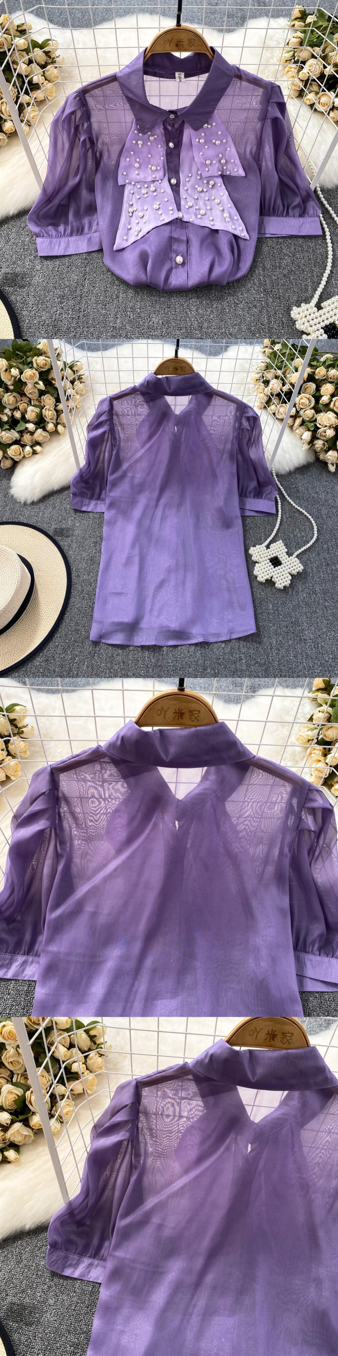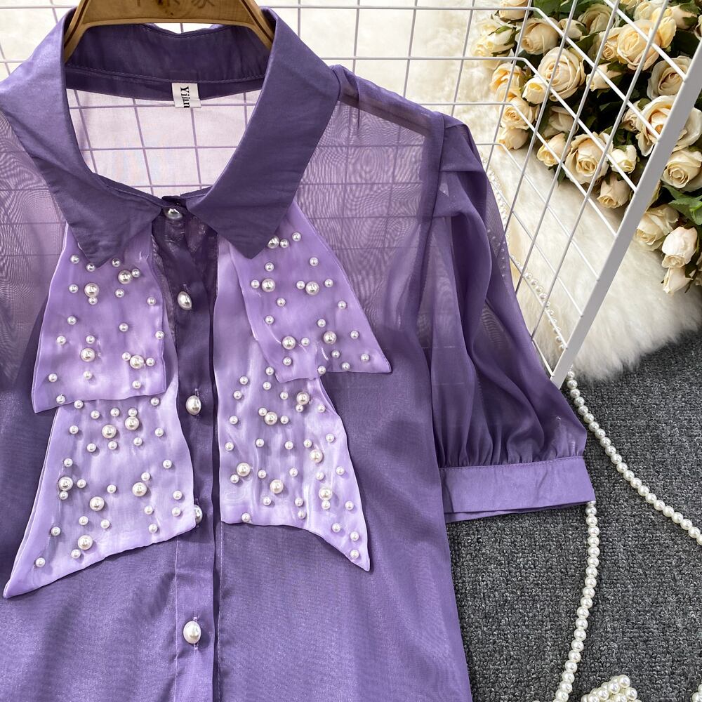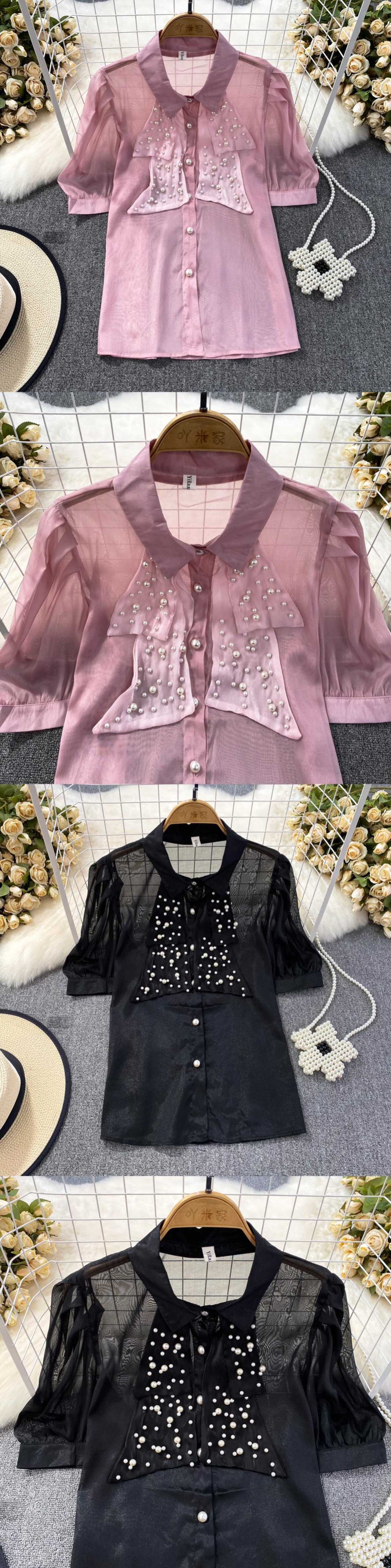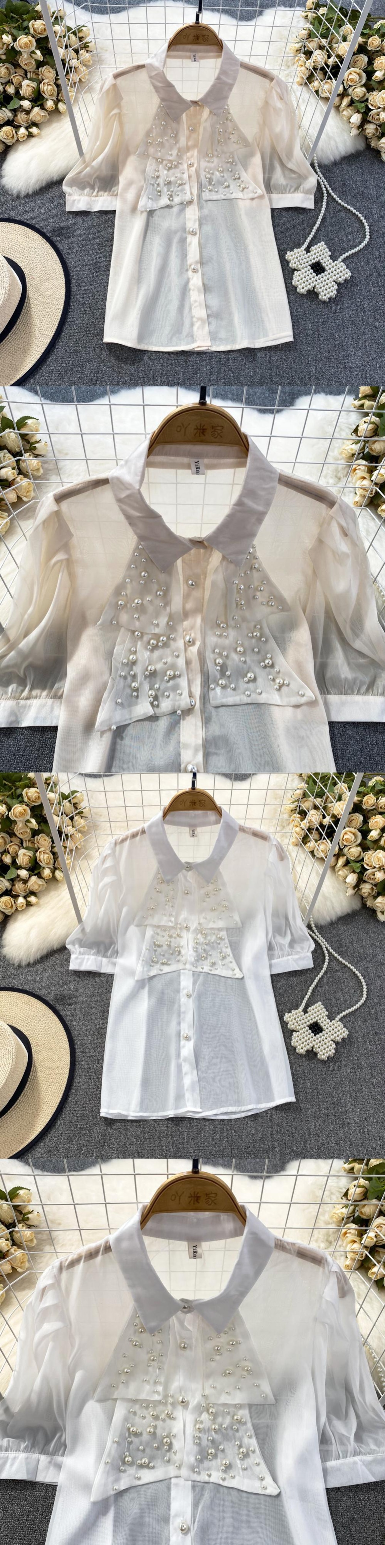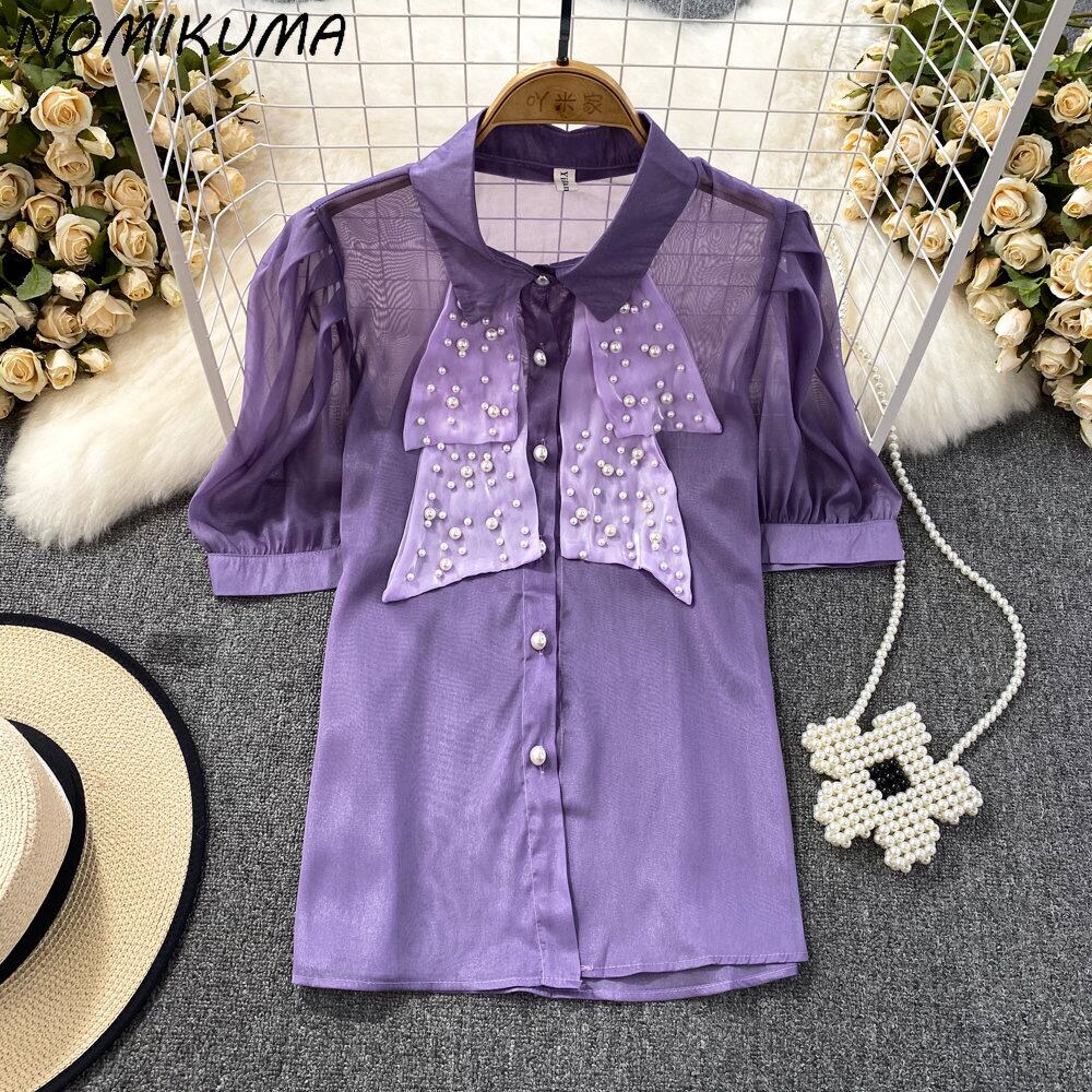 Nomikuma 夏シックビーズシースルーブラウスシャツパフスリーブターンドアンカラーレディーストップス s es サマー 夏物