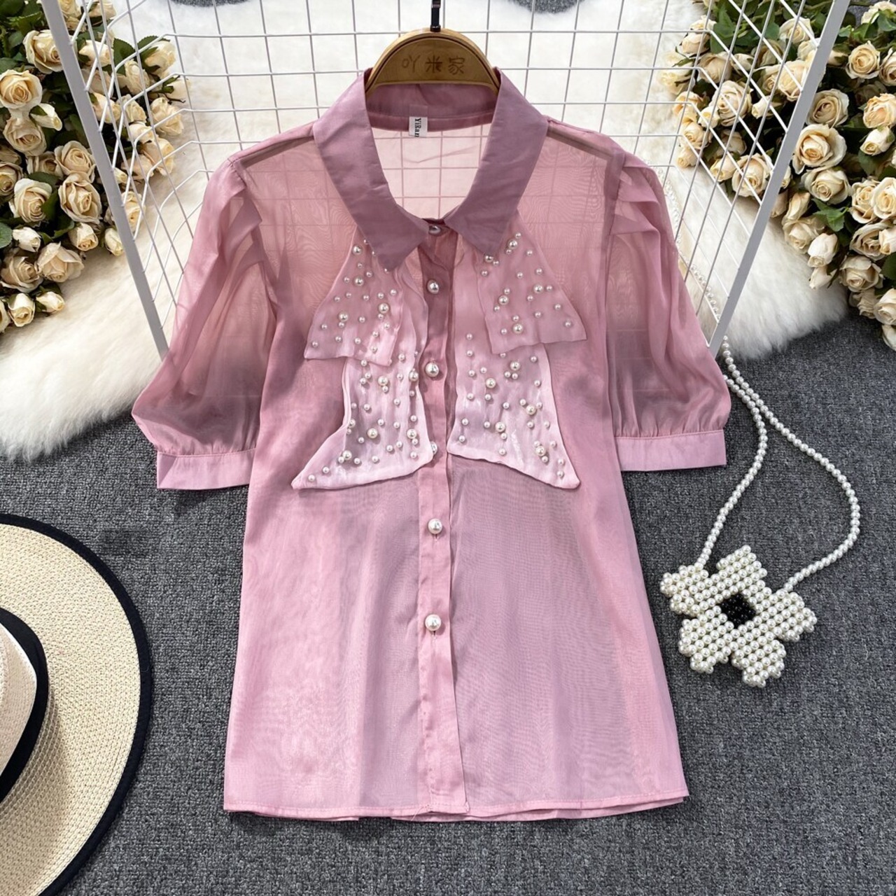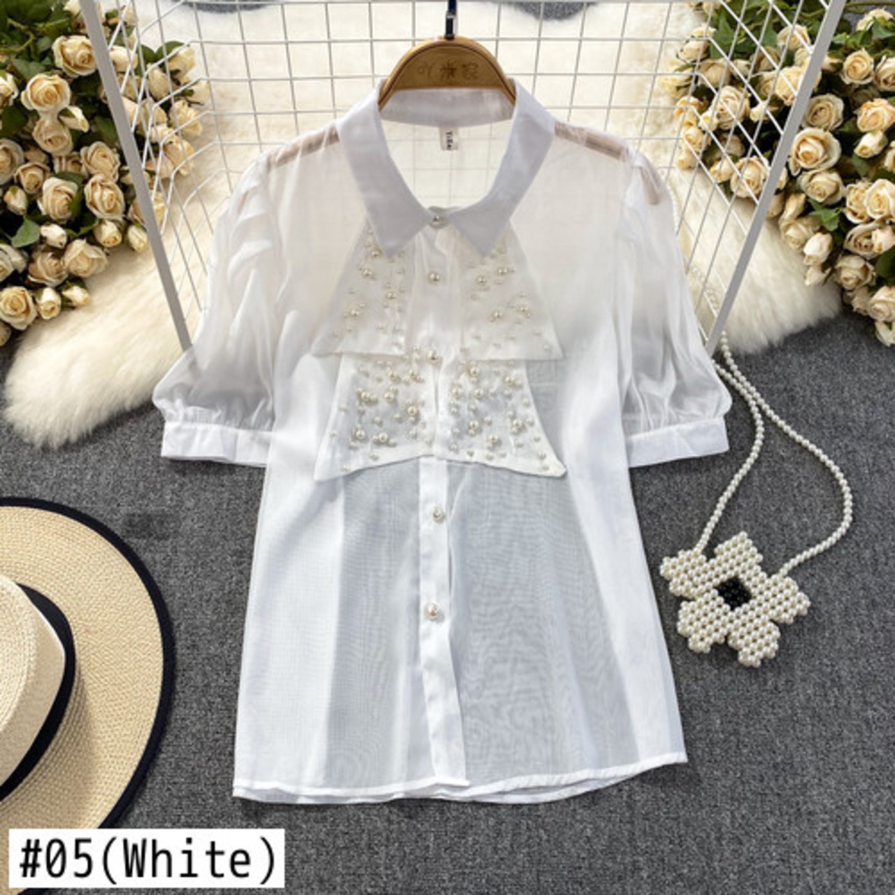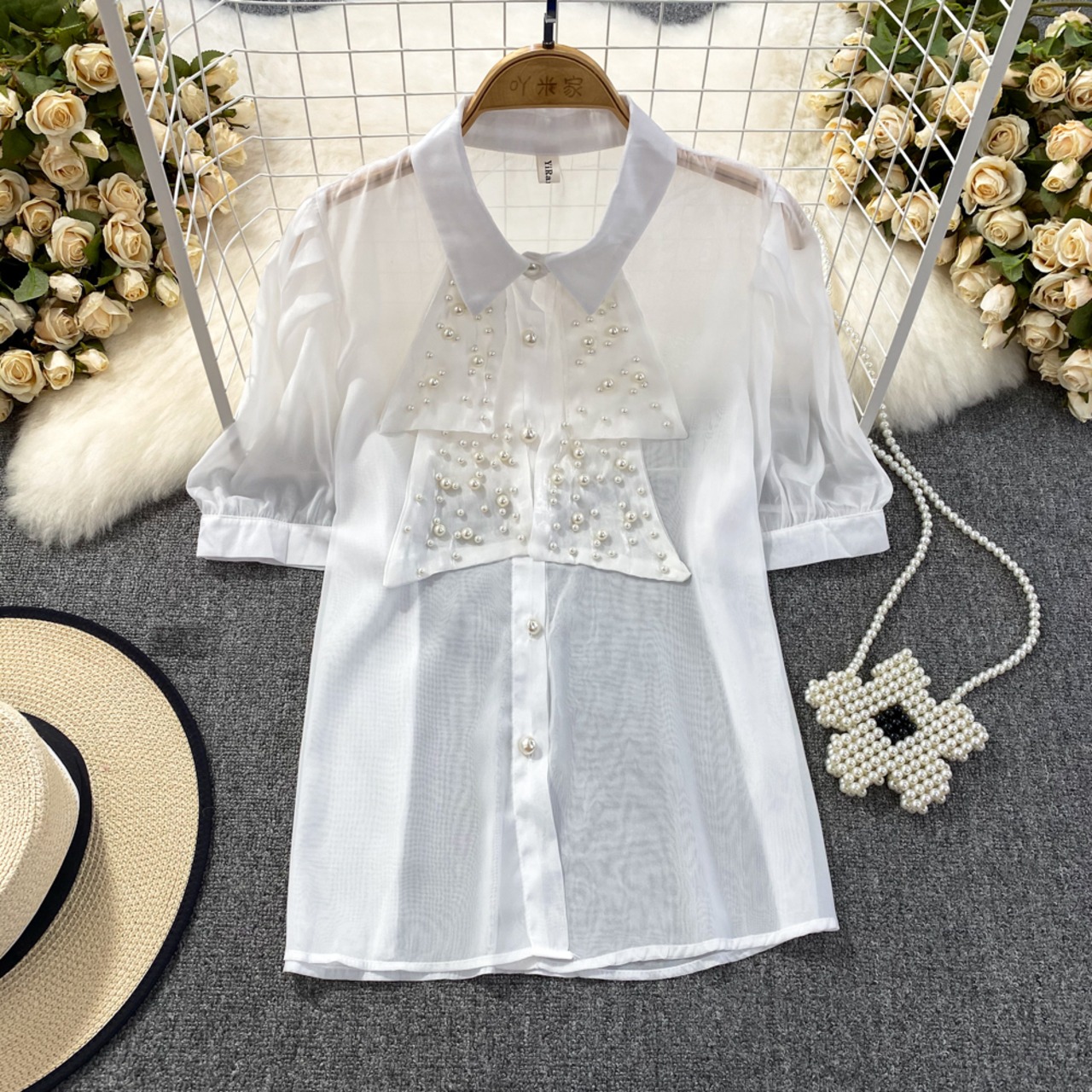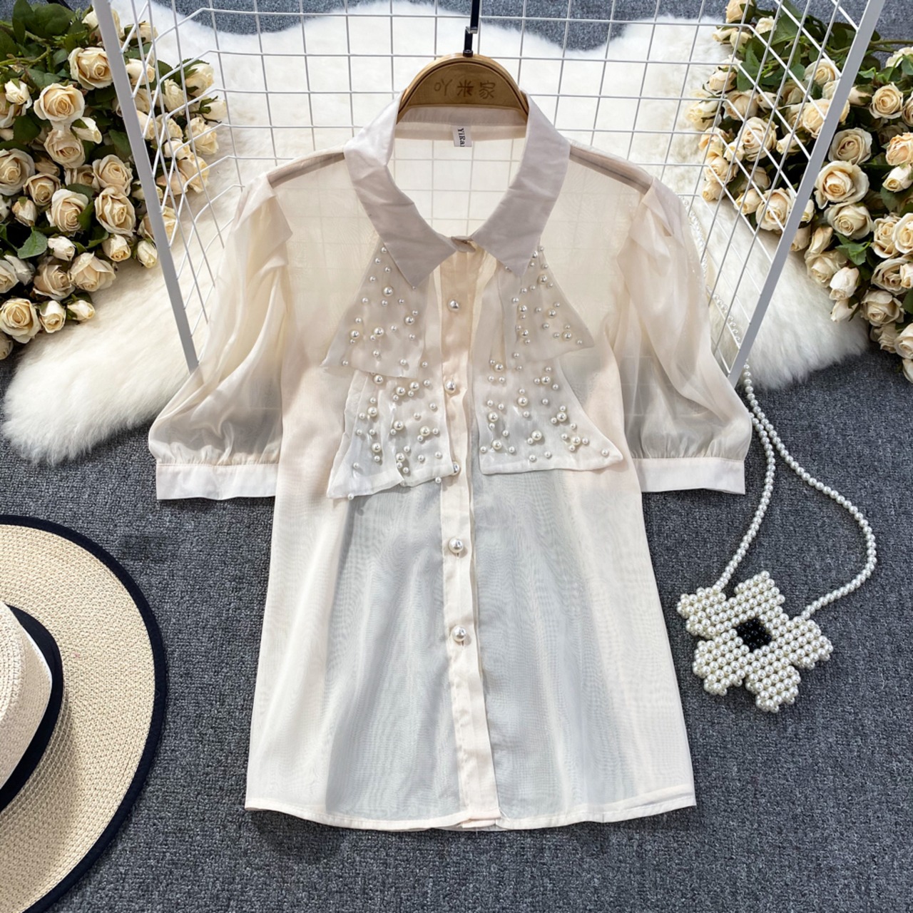 Nomikuma 夏シックビーズシースルーブラウスシャツパフスリーブターンドアンカラーレディーストップス s es サマー 夏物