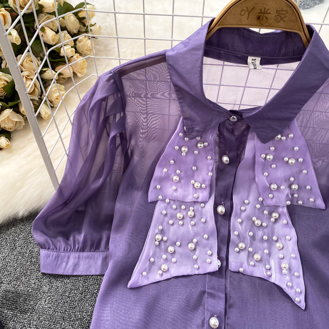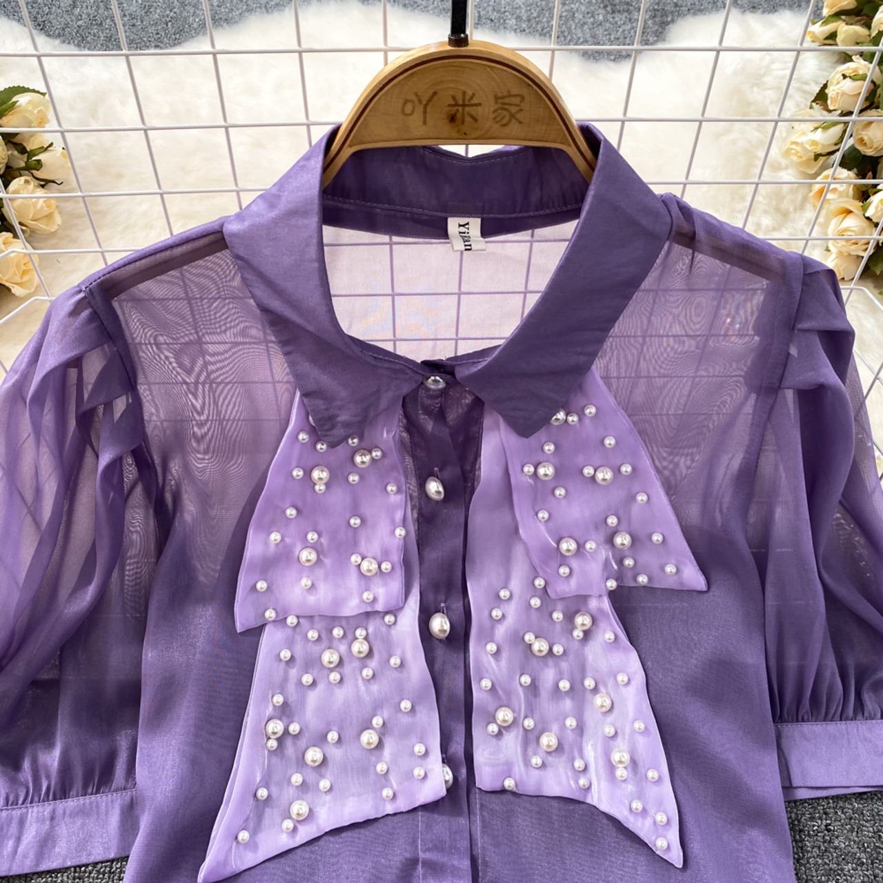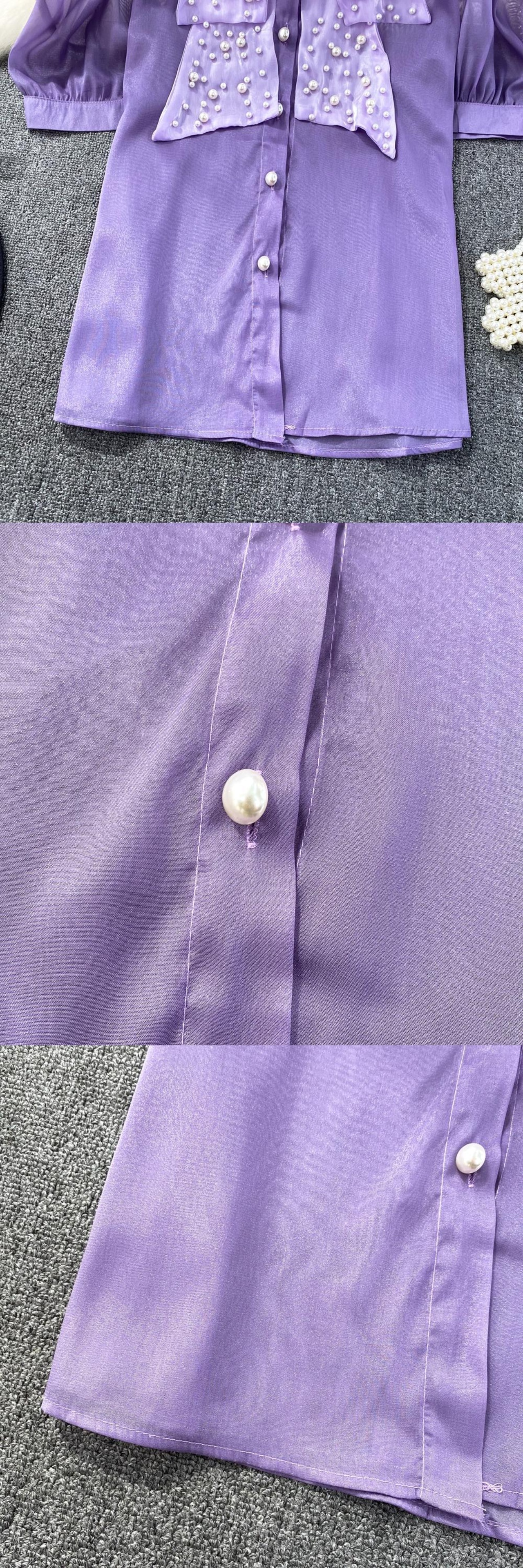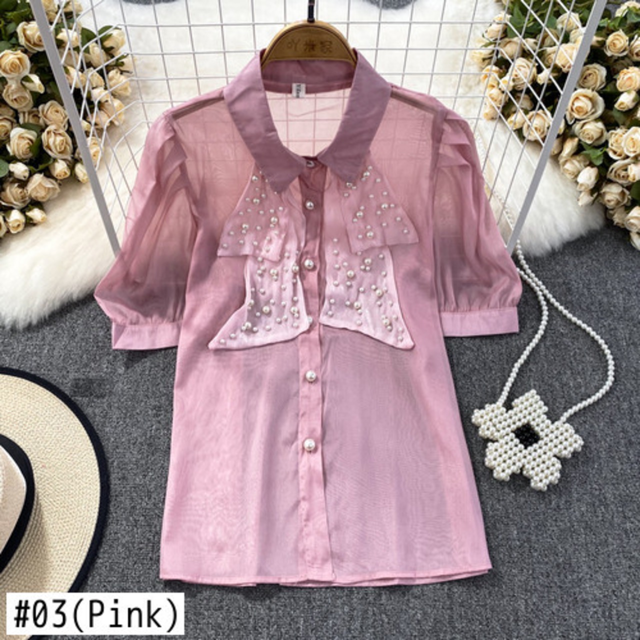 Nomikuma 夏シックビーズシースルーブラウスシャツパフスリーブターンドアンカラーレディーストップス s es サマー 夏物