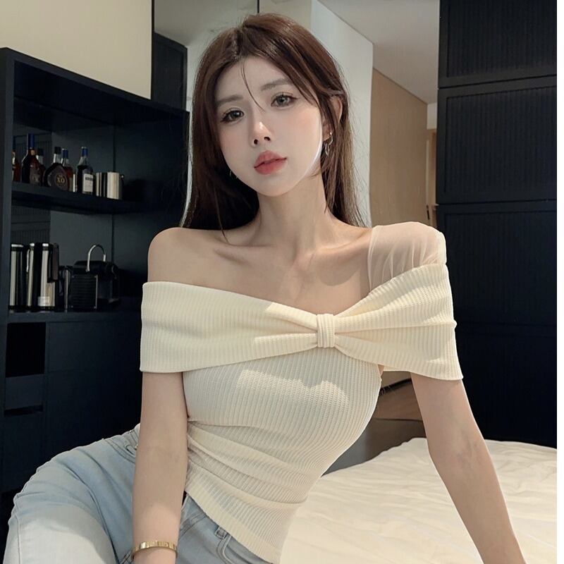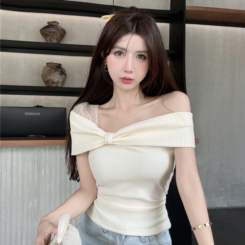 Nomikuma セクシーオフショルダーストラップレスちょう結びスリムフィット Tシャツ夏グラフィック Tシャツ リボン サマー 夏物
