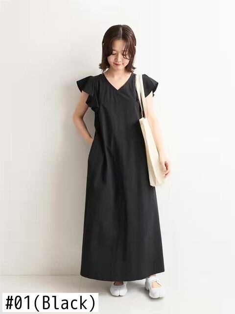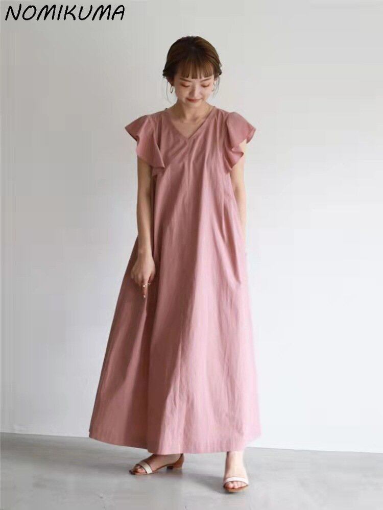 Nomikuma 夏ドレスソリッドカラーフライングスリーブ V ネック A ラインルーズウエスト足首まで長さスタイルドレス サマー 夏物 Vネック Aライン