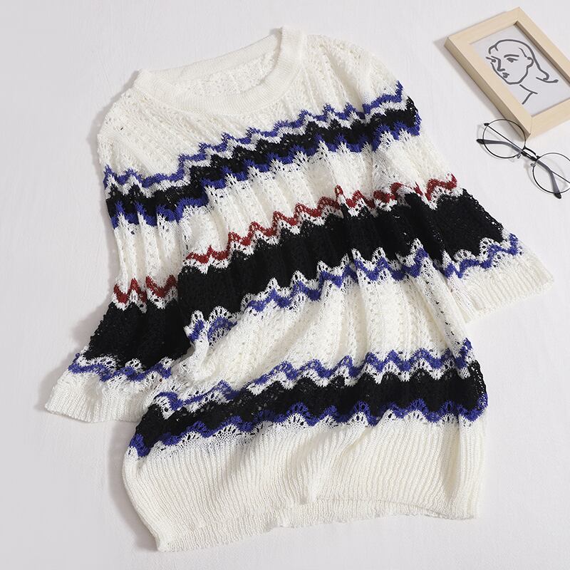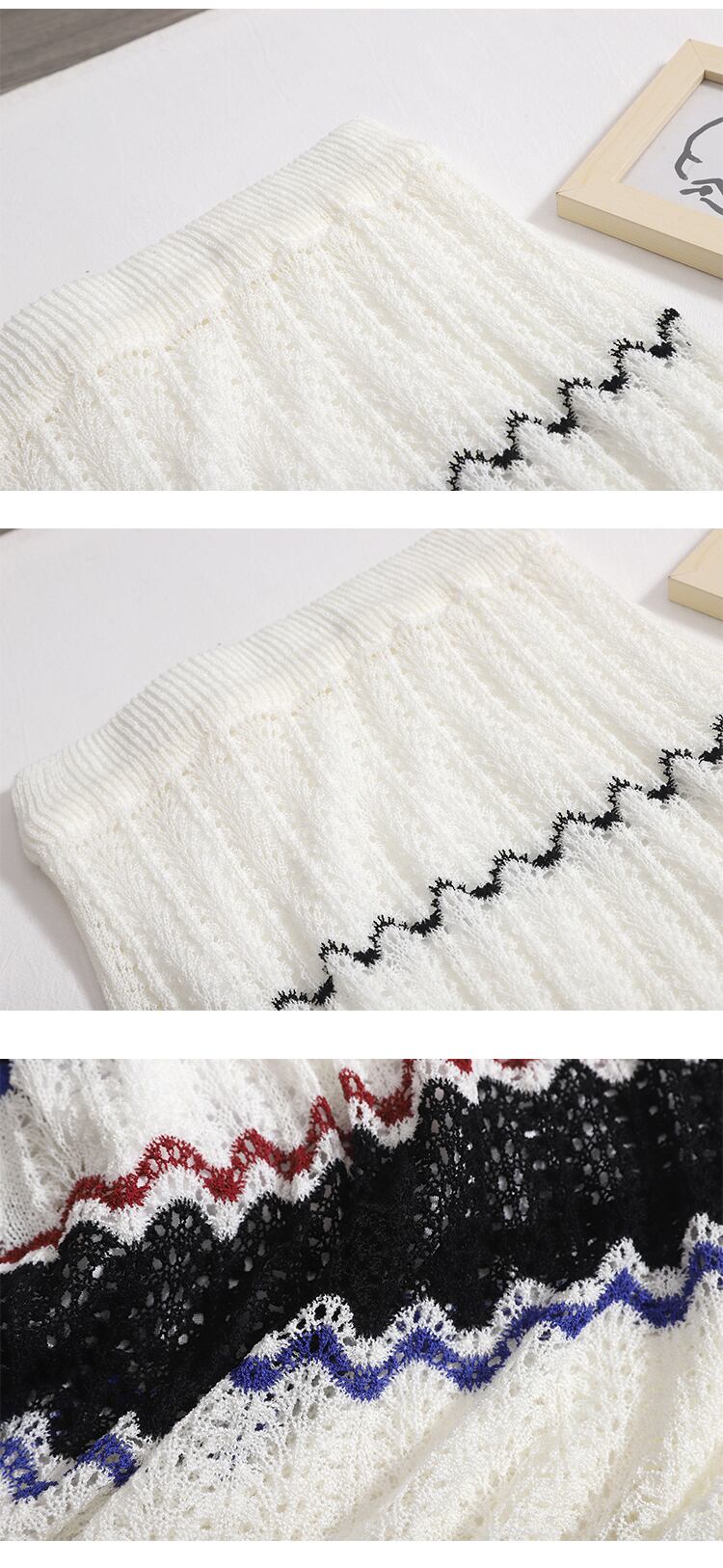 Nomikuma コントラストカラーウェーブストライプニットセット ラウンドネック半袖Tシャツウエストスカート2点セット ショート ハーフスリーブ Oネック