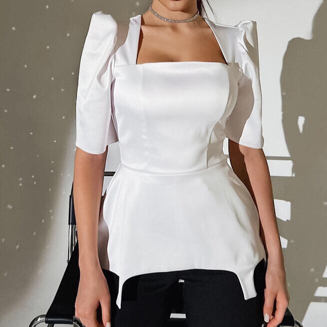 Nomikuma スクエアカラーパフスリーブシャツスリムウエスト不規則ブラウストップス夏 サマー 夏物 スクウェア