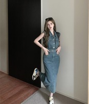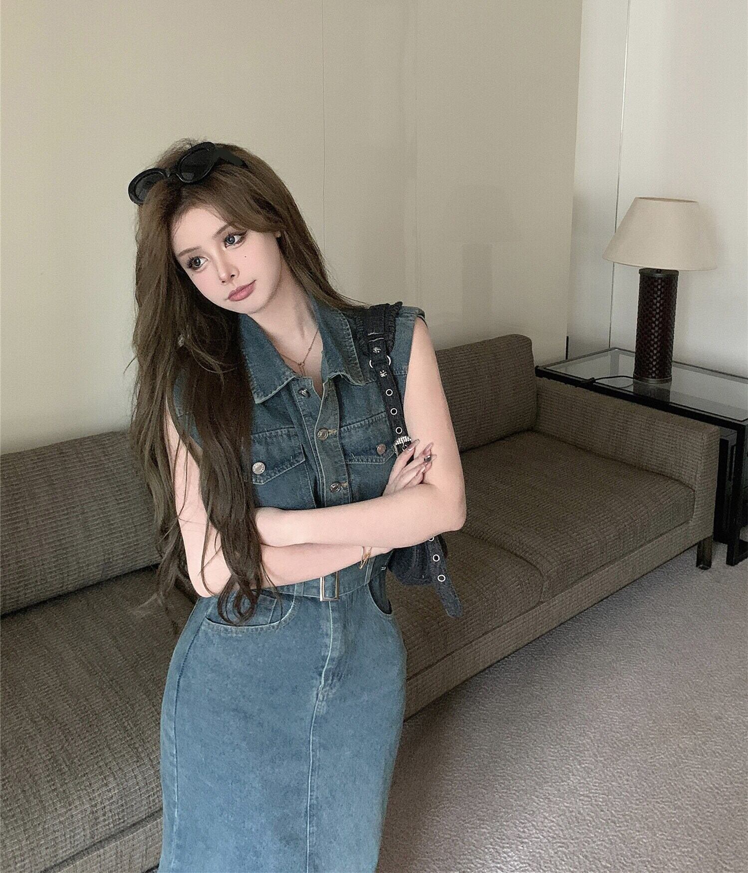 Nomikuma シックターンダウン襟ノースリーブ Demin ドレスベルトスリムウエストセクシースリムジーンズドレス Vestidos ハーネス
