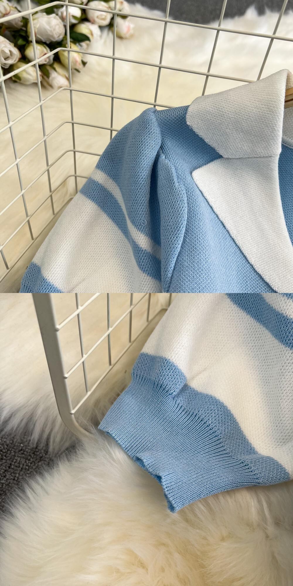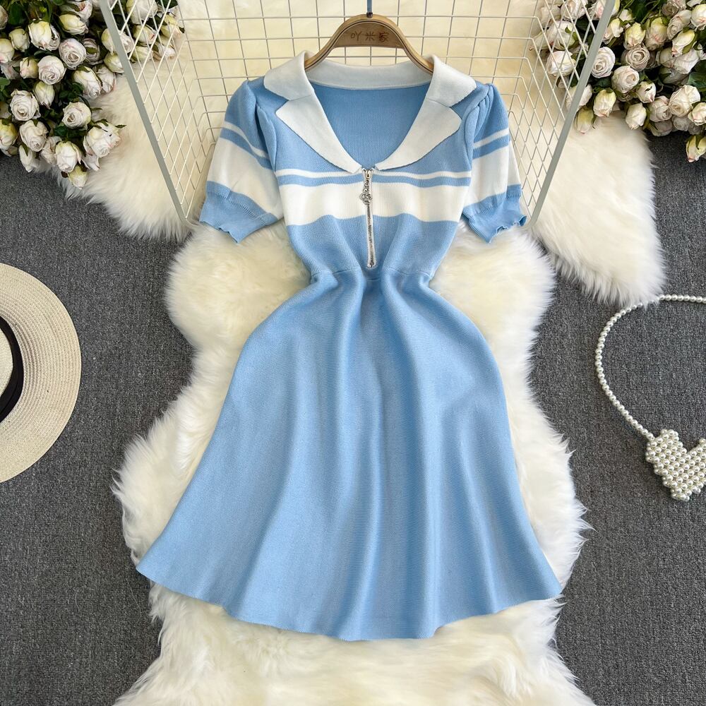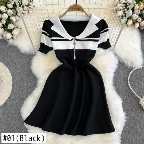 Nomikuma 夏ヒットカラー半袖ターンダウンカラーセータードレススリムウエスト A ラインニットドレス ショート ハーフスリーブ サマー 夏物 Aライン