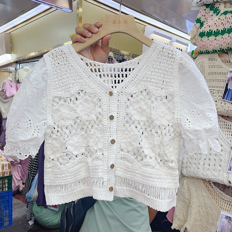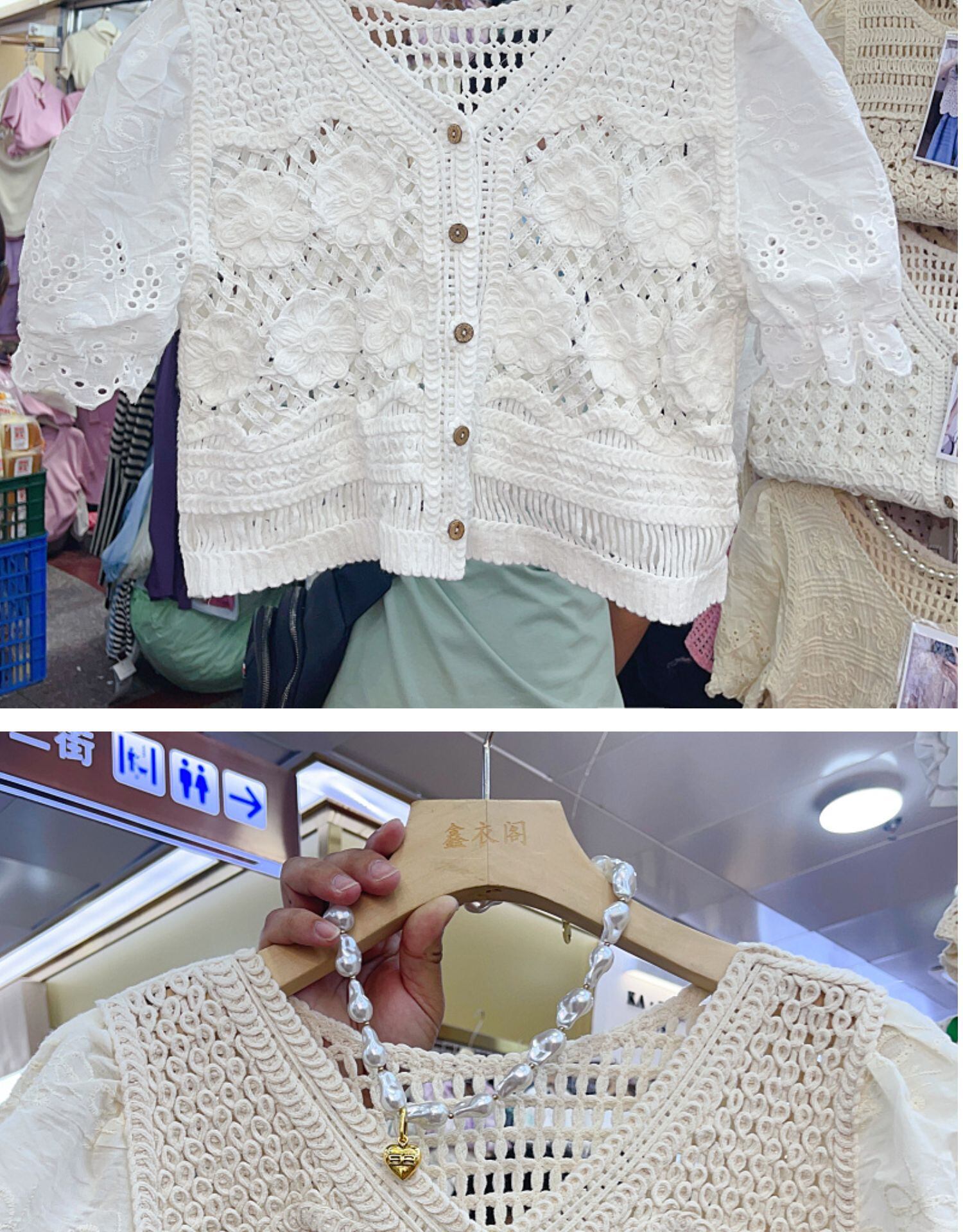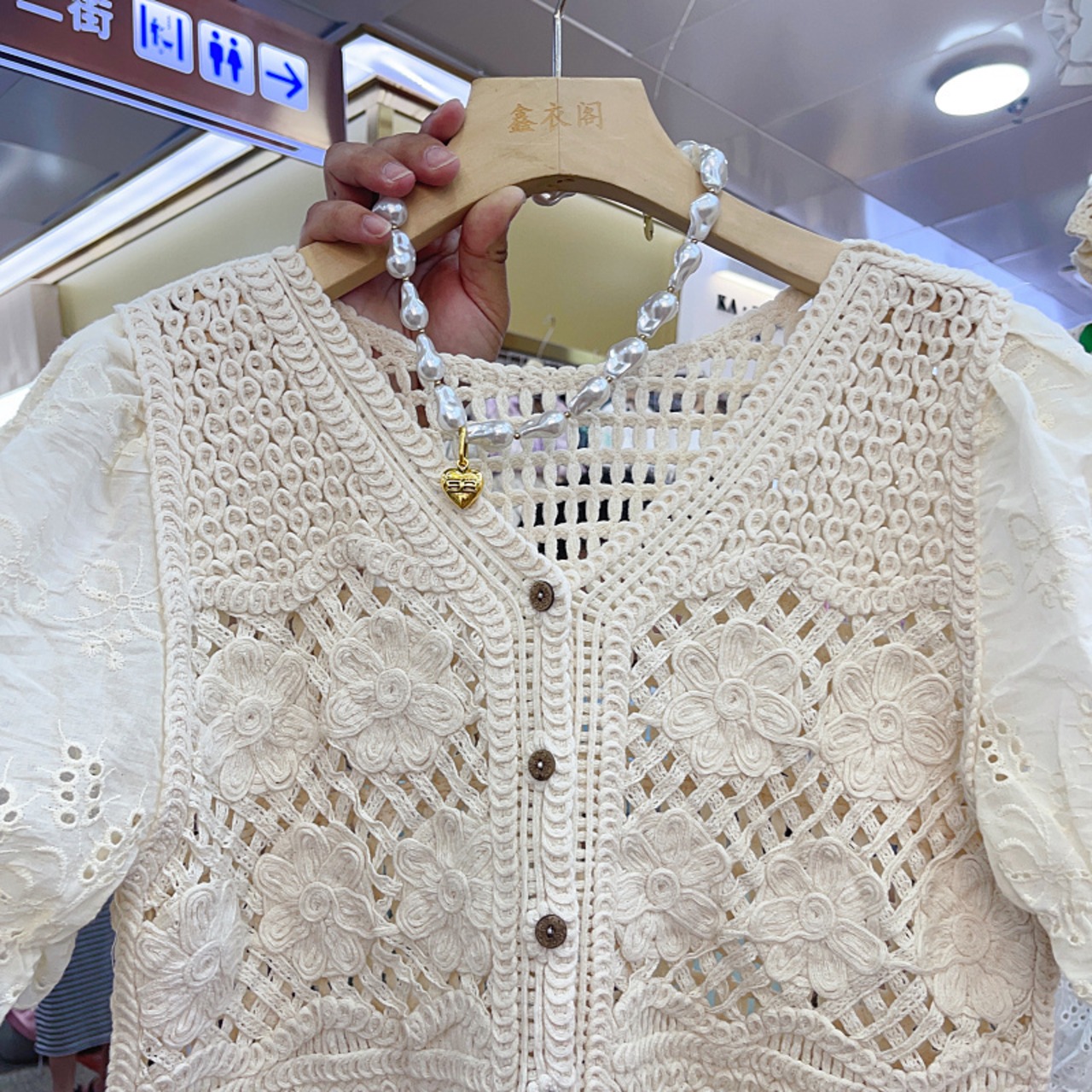 Nomikuma 夏シック V ネックシングルブレストパッチワーク刺繍中空ニットカーディガンセーターコート サマー 夏物 Vネック