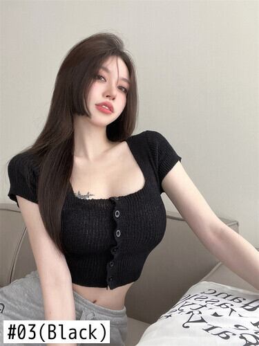 Nomikuma セクシースクエアカラー半袖ニットカーディガントップス夏シングルブレストクロップセーターコート ショート ハーフスリーブ サマー 夏物 スクウェア