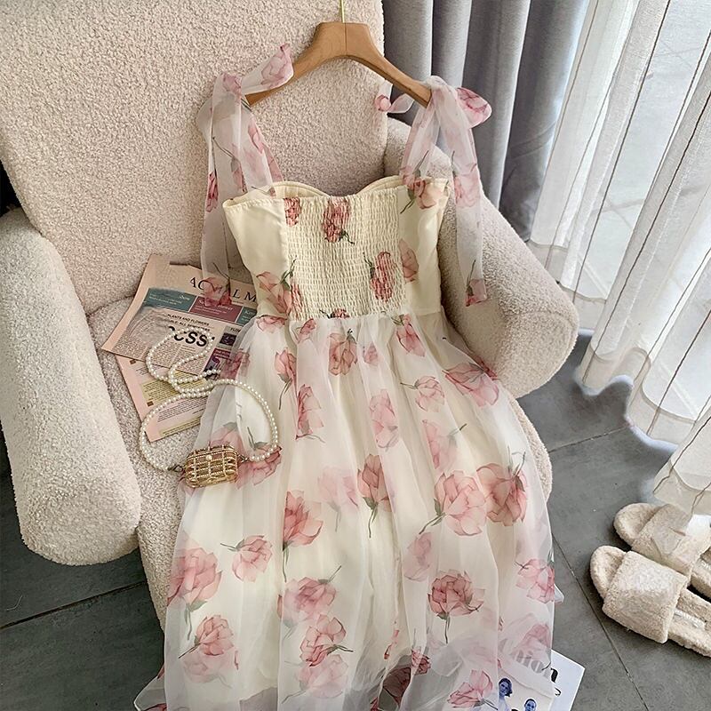 Nomikuma サスペンダードレス蝶ネクタイスリング花柄ドレス春夏ウエスト因果 A ライン Vestidos リボン スプリング 春物 サマー 夏物 Aライン