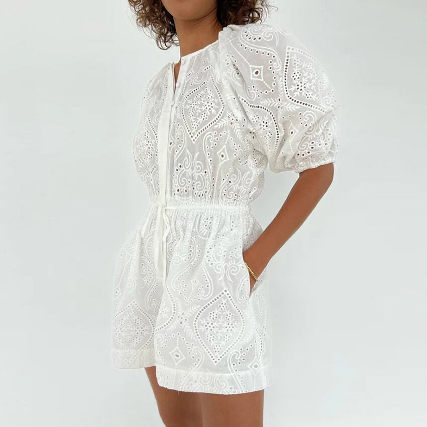 Nomikuma 夏因果ホワイトジャカードロンパース夏レースアップスリムウエストボディスーツシックパフスリーブロンパース サマー 夏物