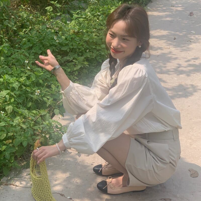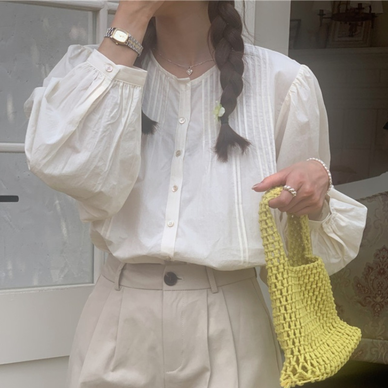 Nomikuma シック夏甘いブラウスシャツ因果ソリッド折り目 O ネック長袖レディーストップス ロング 大人ガーリー スウィート キュート カジュアル サマー 夏物 Oネック ソリッドカラー