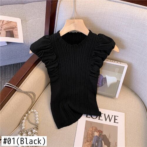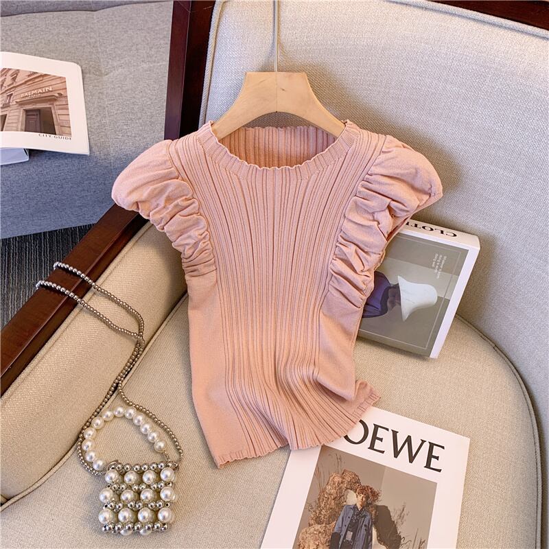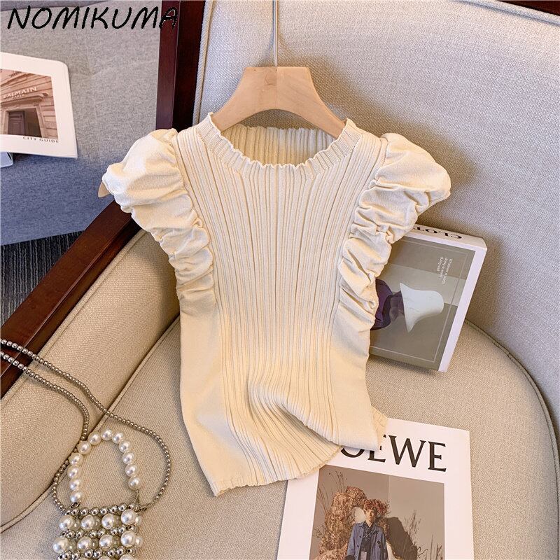 Nomikuma 夏甘いフライングスリーブニットグラフィック Tシャツスリムシャツ底 Y2k トップゴシック 大人ガーリー スウィート キュート カジュアル サマー 夏物