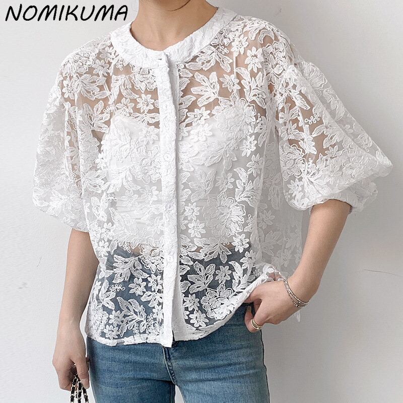 Nomikuma スタイル甘い刺繍花柄レースシャツコートランタンスリーブシングルブレスト O ネックブラウス夏 大人ガーリー スウィート キュート カジュアル サマー 夏物 Oネック