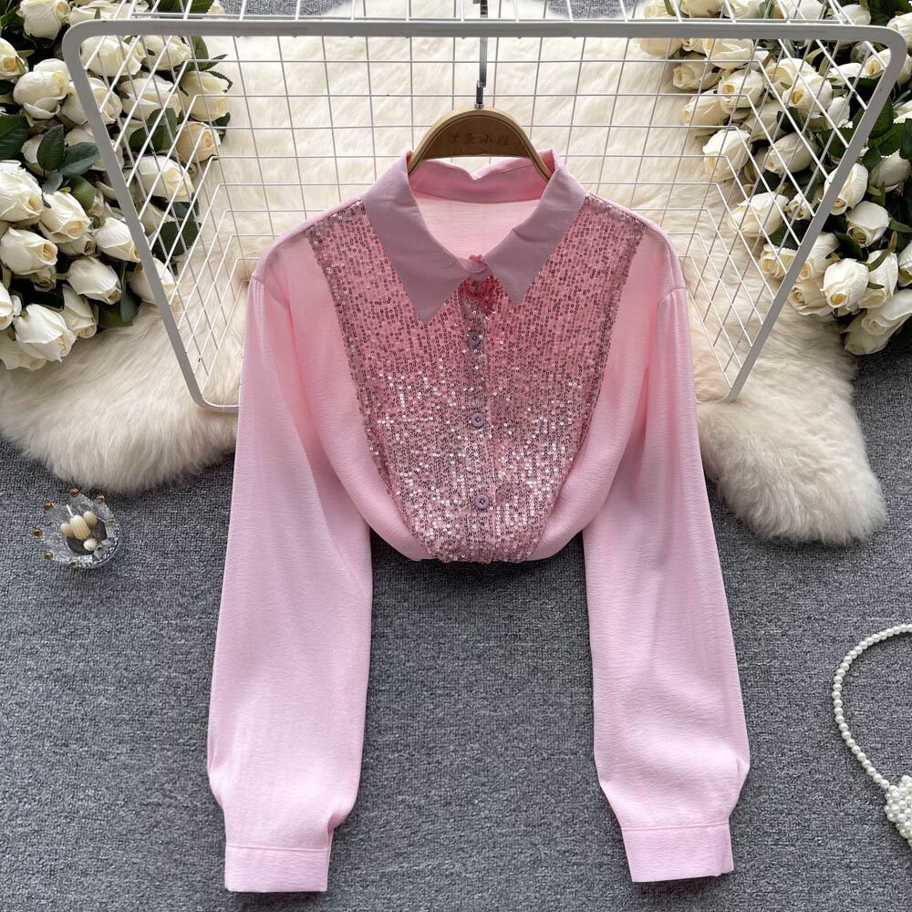 Nomikuma スパンコールパッチワーク長袖ブラウス長袖ターンダウンカラーシャツトップス ロング