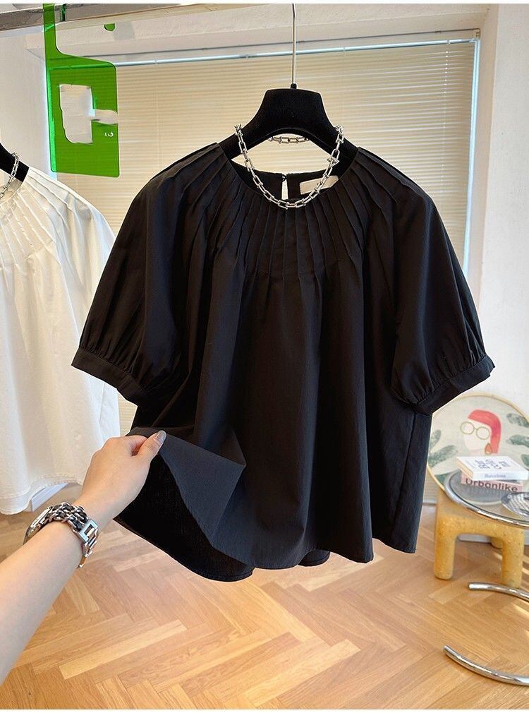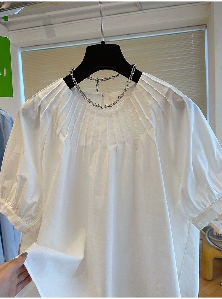 Nomikuma ひだ O ネック パフ スリーブ ドール シャツ シック スイート レディース トップス 夏 ソリッド プルオーバー デ 大人ガーリー スウィート キュート カジュアル サマー 夏物 Oネック ソリッドカラー
