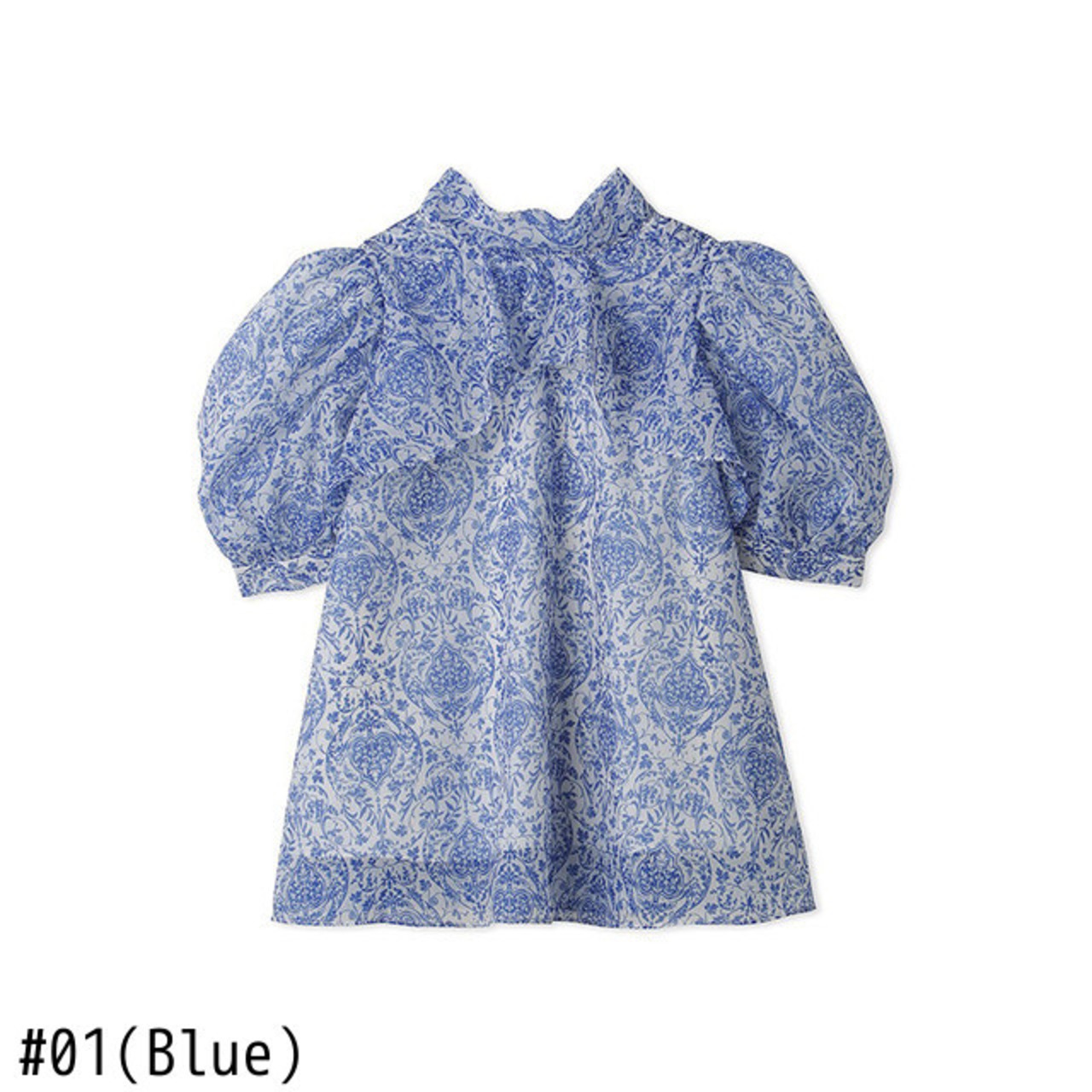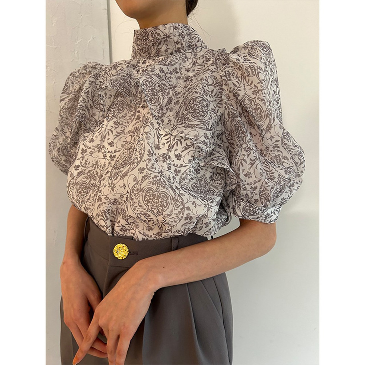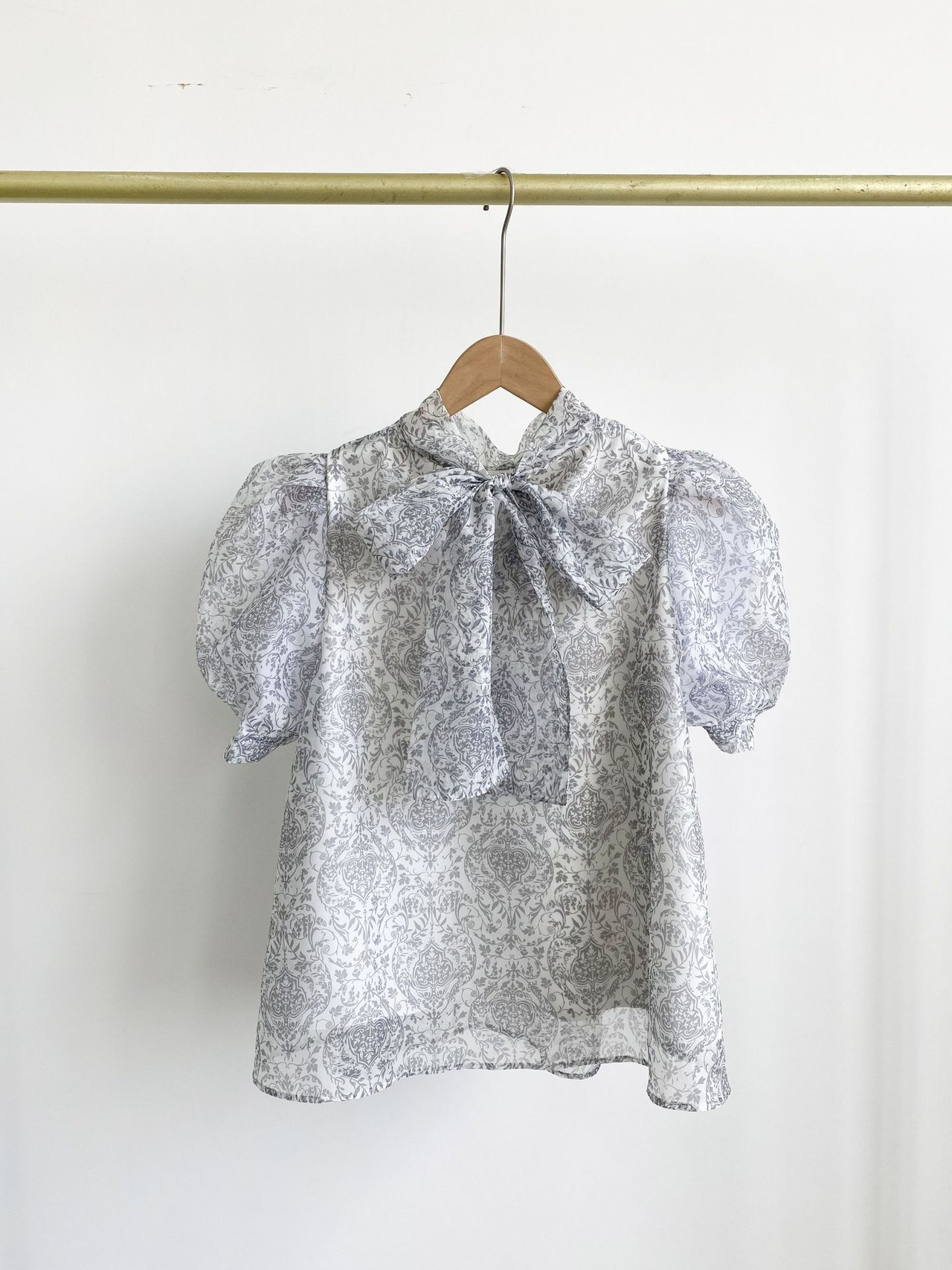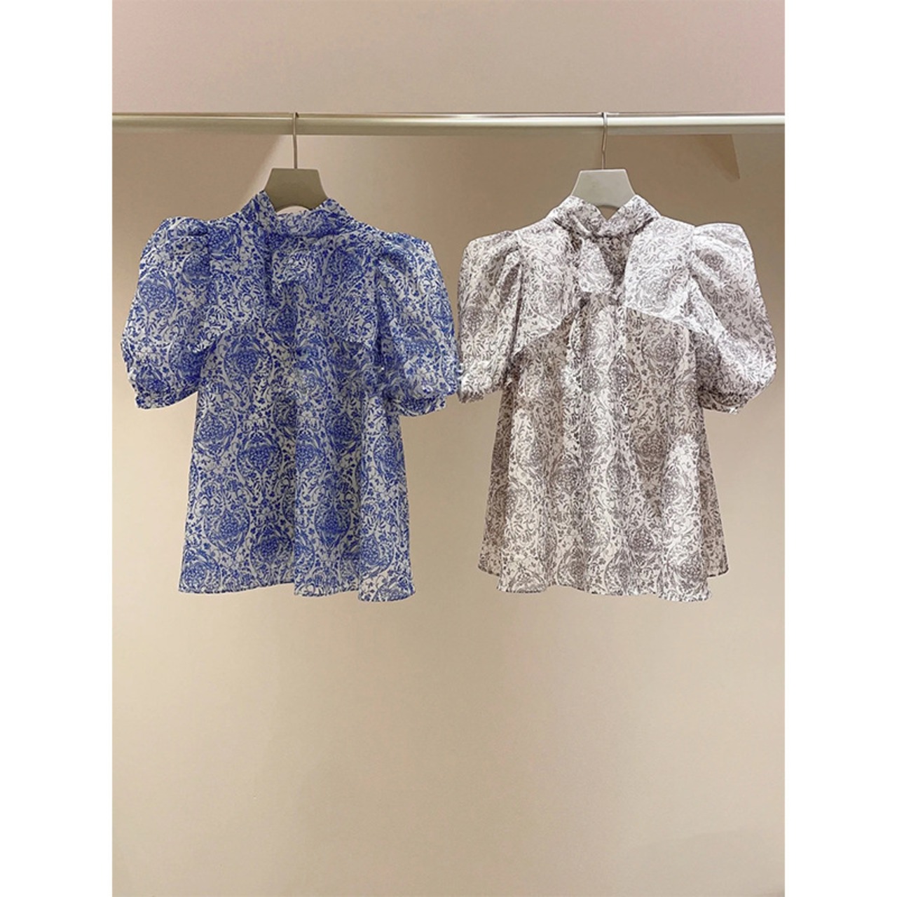 Nomikuma ブラウススタイル夏プリントデシックパフスリーブスタンドネックリボン包帯シフォントップス サマー 夏物