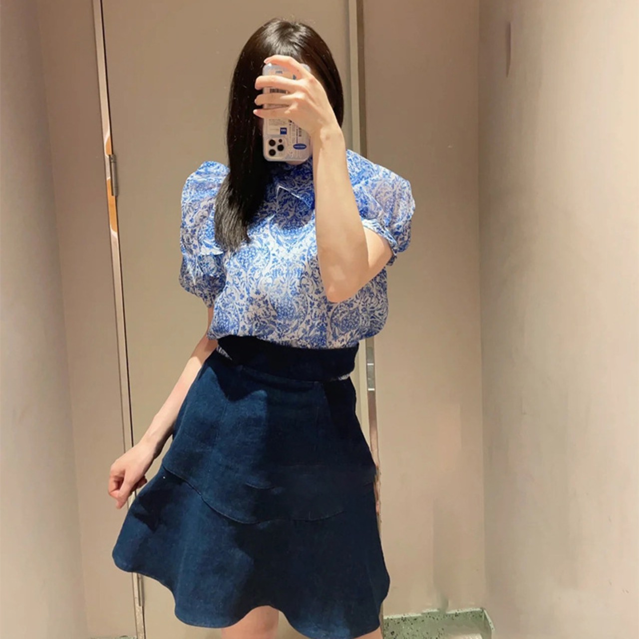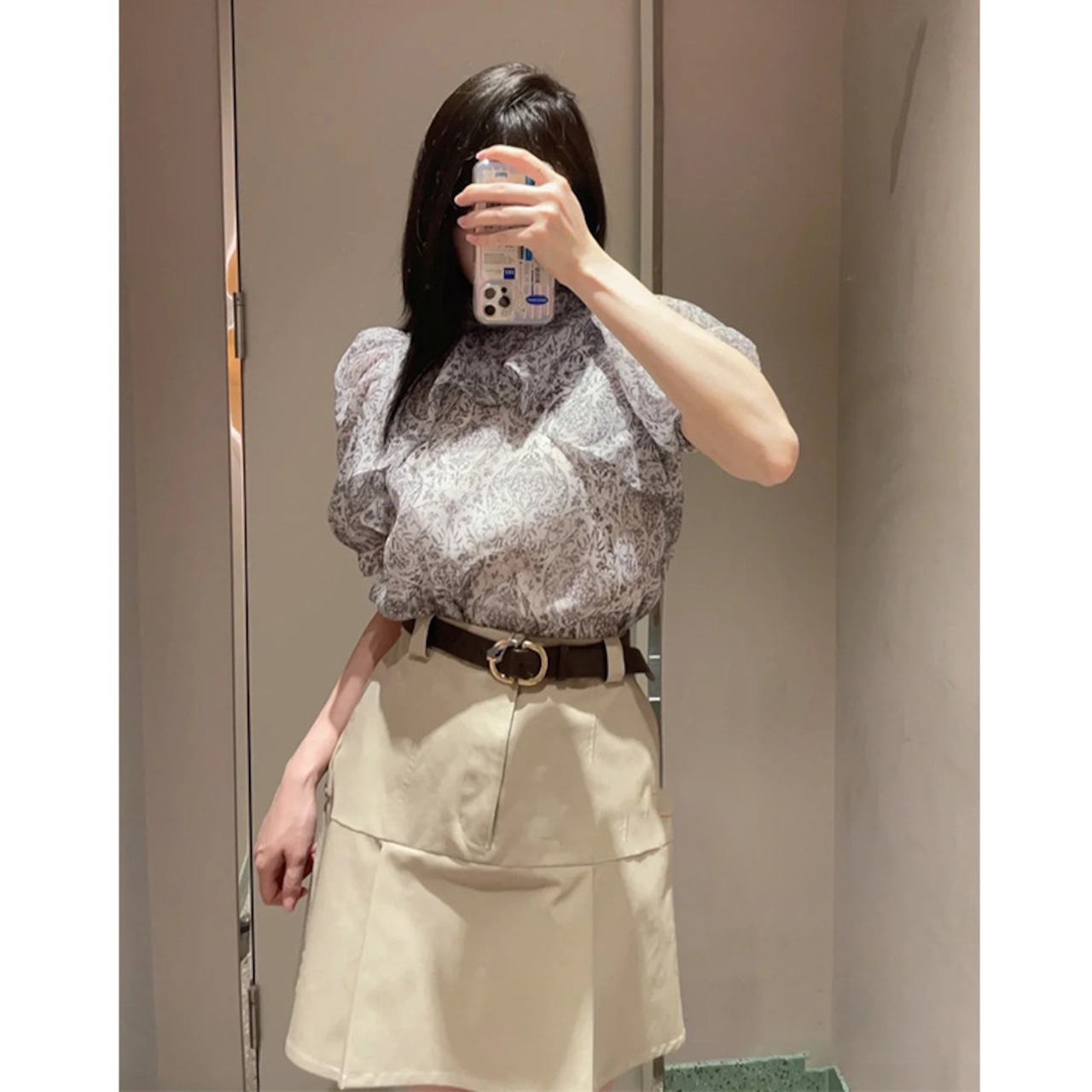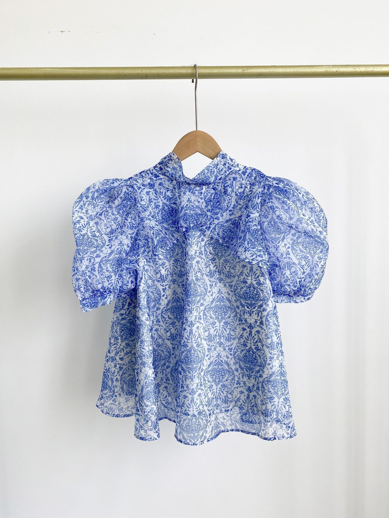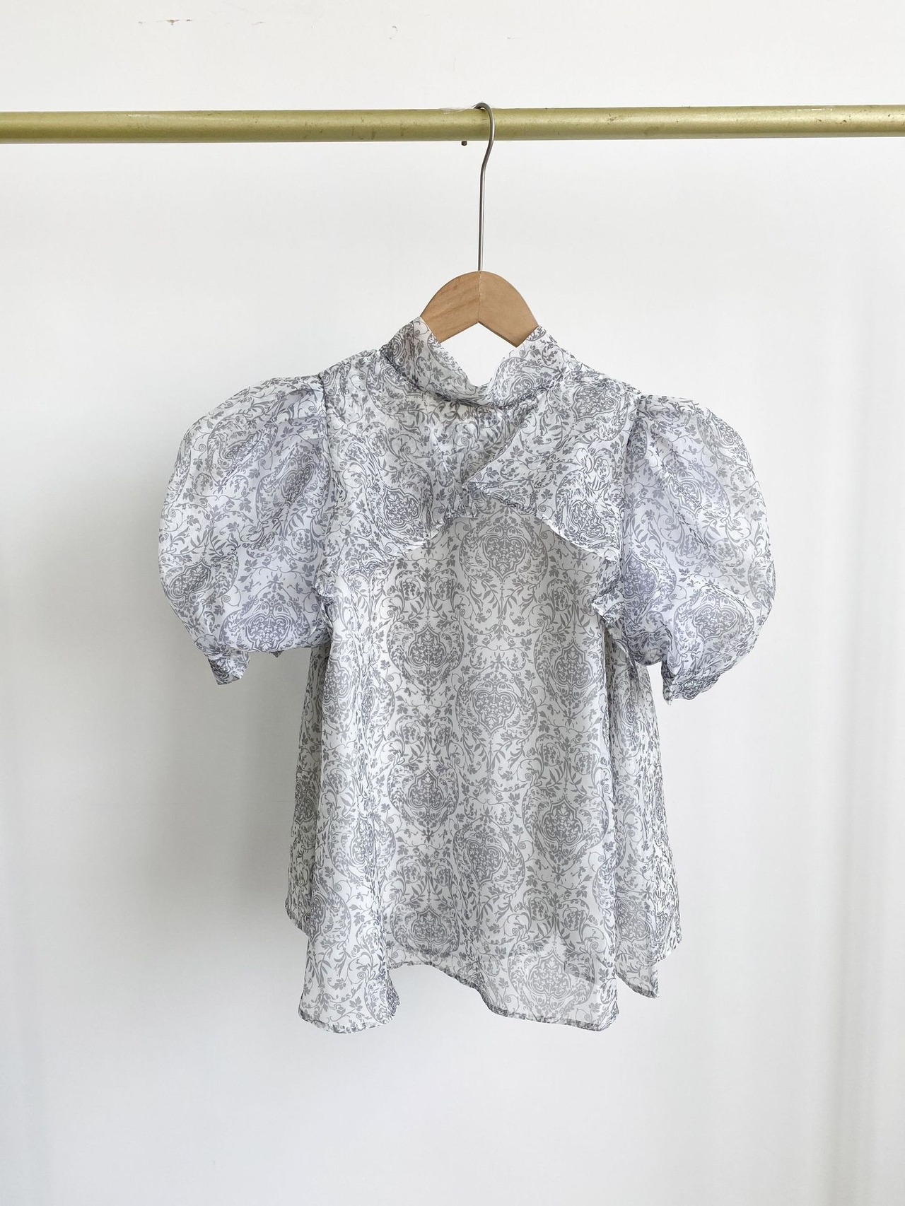 Nomikuma ブラウススタイル夏プリントデシックパフスリーブスタンドネックリボン包帯シフォントップス サマー 夏物