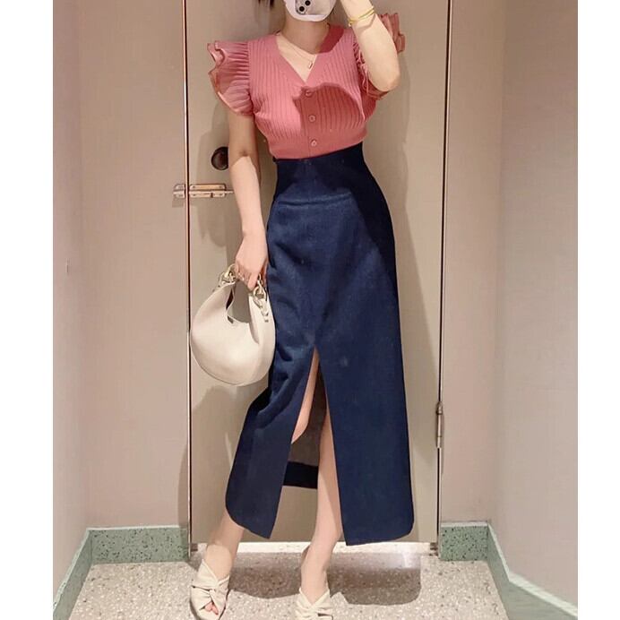 Nomikuma スタイル 2 点セットレディース衣装シックフリル V ネックスリムニットトップス + ウィストセクシースプリットスカート Vネック
